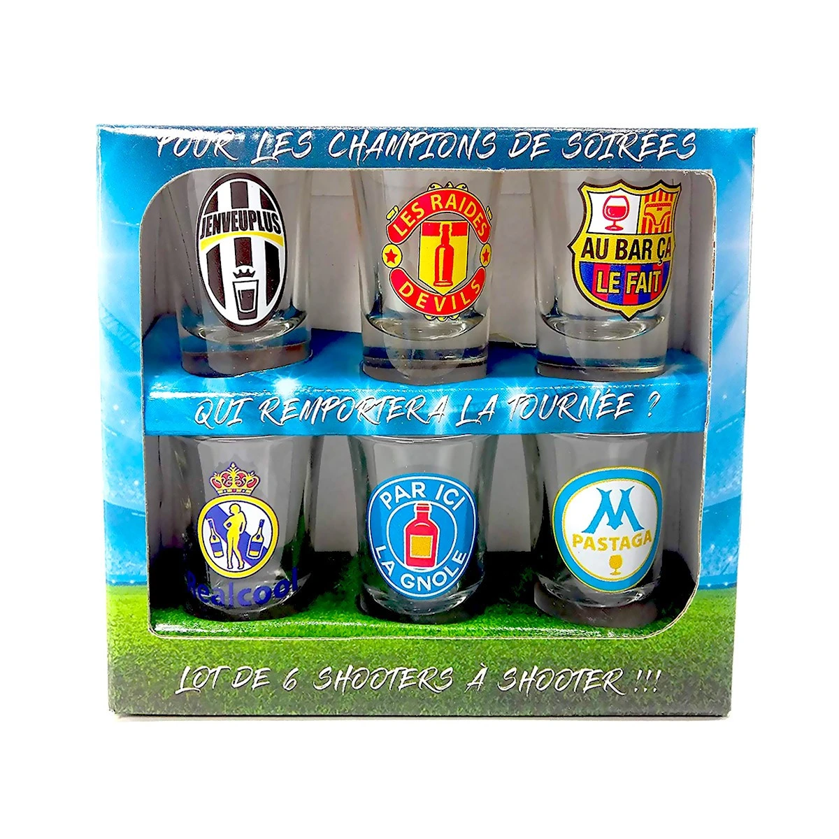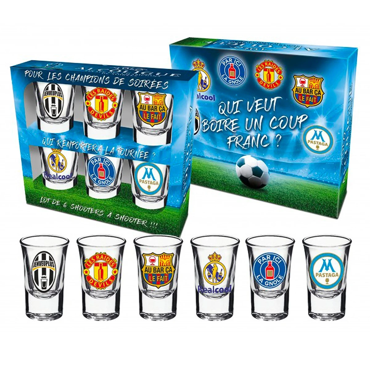 Cet ensemble humoristique comprend sur les plus grands clubs de foot. Les amateurs de football reconnaîtront leur équipe de foot préférée parmi « Au bar çà le fait », « Om Pastaga », « Par ici la gnole », « jenveuxplus », « les raides devils » ou les « Realcool ». Chaque emblème imprimé sur les verres à liqueur est une version détournée avec humour de celui de chacun de ces clubs mythiques. Fou-rires garantis pour tous ceux qui voudront boire un coup franc !