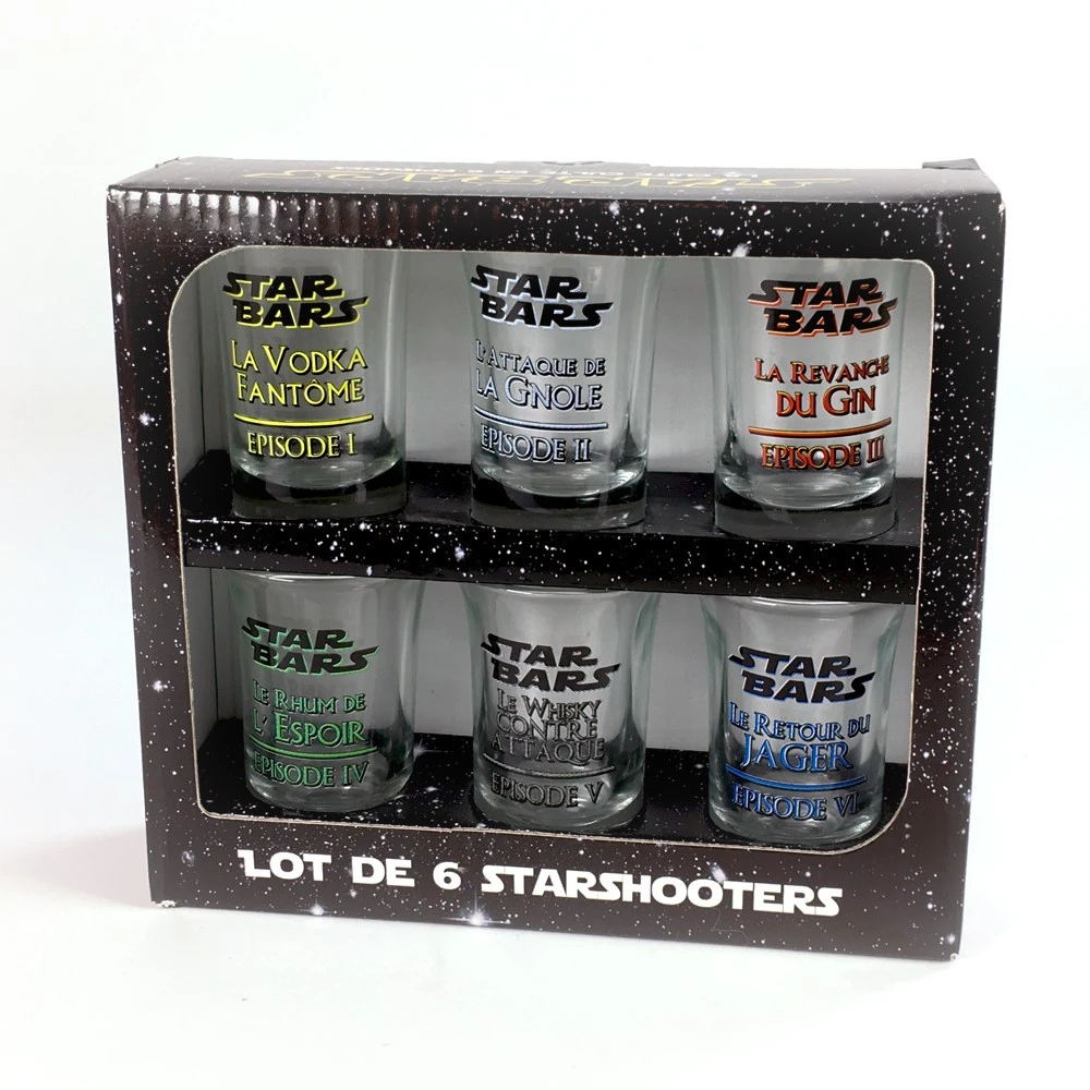 - 6 verres à liqueur parodiques basés sur la saga cinématographique Star Wars,
