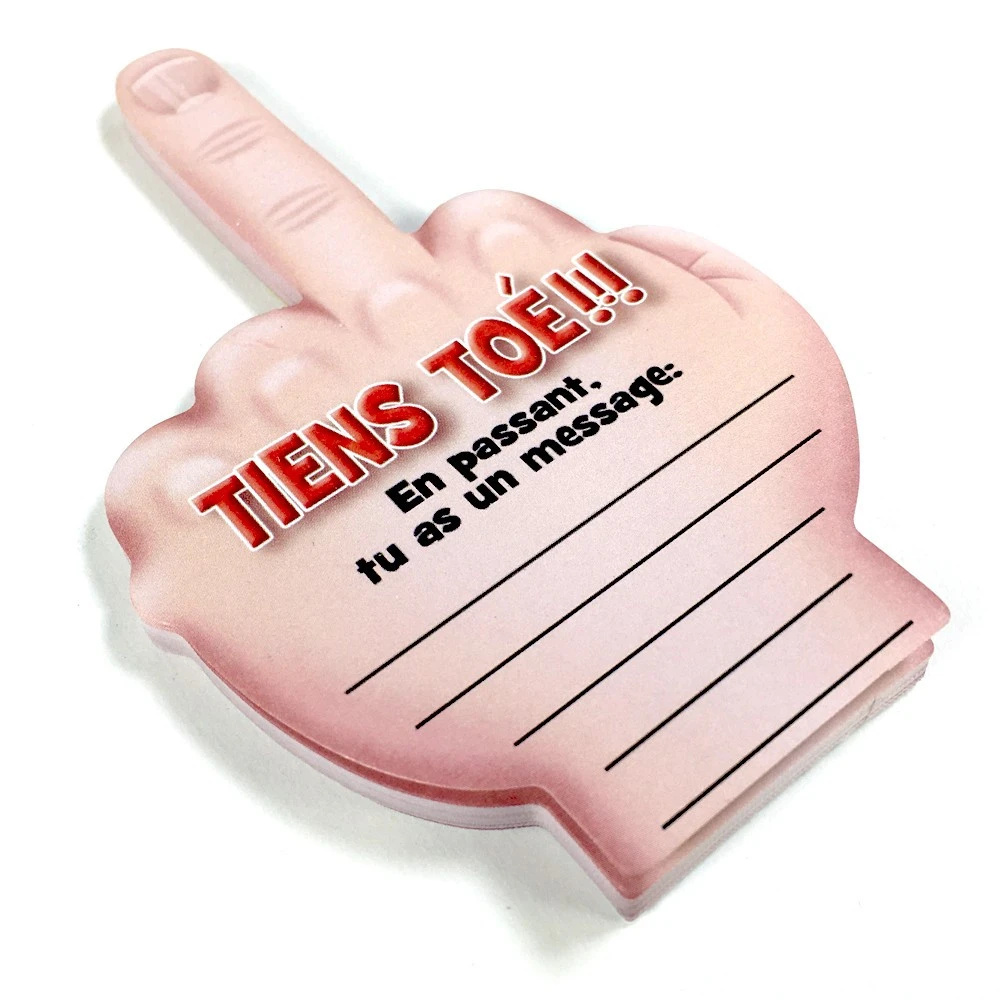 Le bloc-notes « Tiens toé… » (à prononcer à la manière de nos amis Canadiens) annonce immédiatement la couleur ! les notes adhésives repositionnables à la manière d’un Post-it sont en forme de main avec le majeur dressé. Un doigt d’honneur qui attire en principe tout de suite l’attention, il ne vous reste plus qu’à laisser votre message au destinataire dont la curiosité aura été attisée par ce majeur dressé !