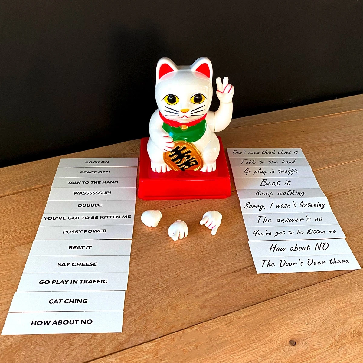 Nous vous proposons ici un petit Maneki neko (nom japonais) dans la tradition du chat porte-bonheur japonais, sauf que celui-ci dispose de 4 mains interchangeables parmi lesquelles l’une fait un En fonction de votre humeur, vous pourrez greffer la main de votre choix sur votre chat insolent et il l’agitera sans discontinuer. Il peut bouger la patte avec le majeur dressé tant qu’il y a de l’énergie dans ses piles, et elles durent longtemps ! Haut de ses quinze centimètres, le félin effronté trouvera forcément sa place chez vous , sur votre bureau, dans votre boutique ou magasin pour saluer aimablement tous ceux qui poseront le regard sur lui. Sa base permet d’afficher l’un des douze messages fournis (en anglais), vous pourrez également le personnaliser avec le message de votre choix. Nous espérons grandement qu’il vous porte chance !