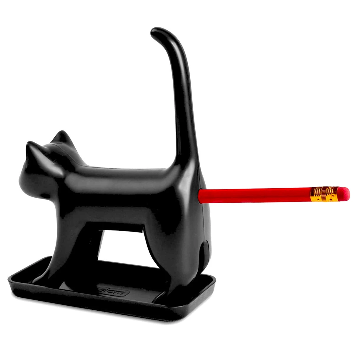 Voici le taille-crayon le plus insolite que nous ayons trouvé jusqu’à maintenant ! le est comme son nom l’indique, un chat… et un taille-crayon… Ce mignon petit félin en plastique noir est sagement installé au dessus de sa litière. Vous n’avez qu’une chose à faire, prendre un crayon, l’insérer dans son arrière-train (il y a effectivement un trou à cet endroit), puis tourner votre crayon : le chat miaule (de douleur, pense-t-on…) mais votre crayon ressort affûté comme jamais ! et comme l’objet est très bien pensé, les copeaux de crayon tombent dans la litière. Efficace, insolite, amusant. NB : NE JAMAIS ESSAYER DE TAILLER SES CRAYONS AVEC UN VRAI CHAT (même très sociable).