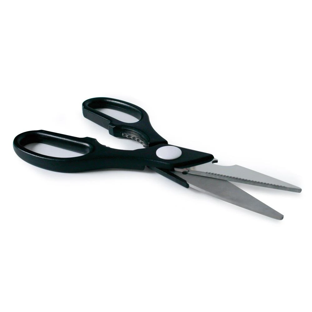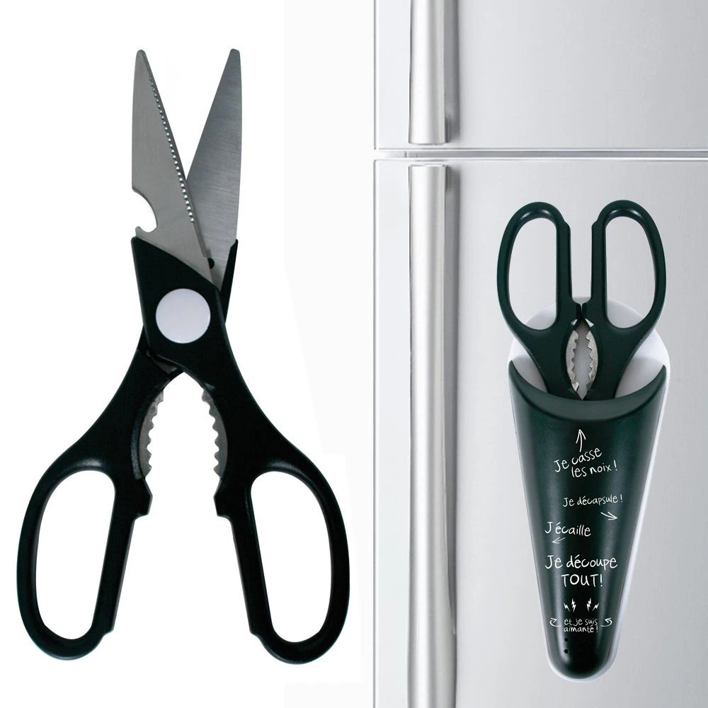 Qui suis-je ? Je découpe tout, j’écaille, je décapsule, je dévisse les bouchons, je casses les noix, je suis ambidextre, mon support est aimanté… je suis ? je suis ?? La paire de Ciseaux de cuisine multifonctions !