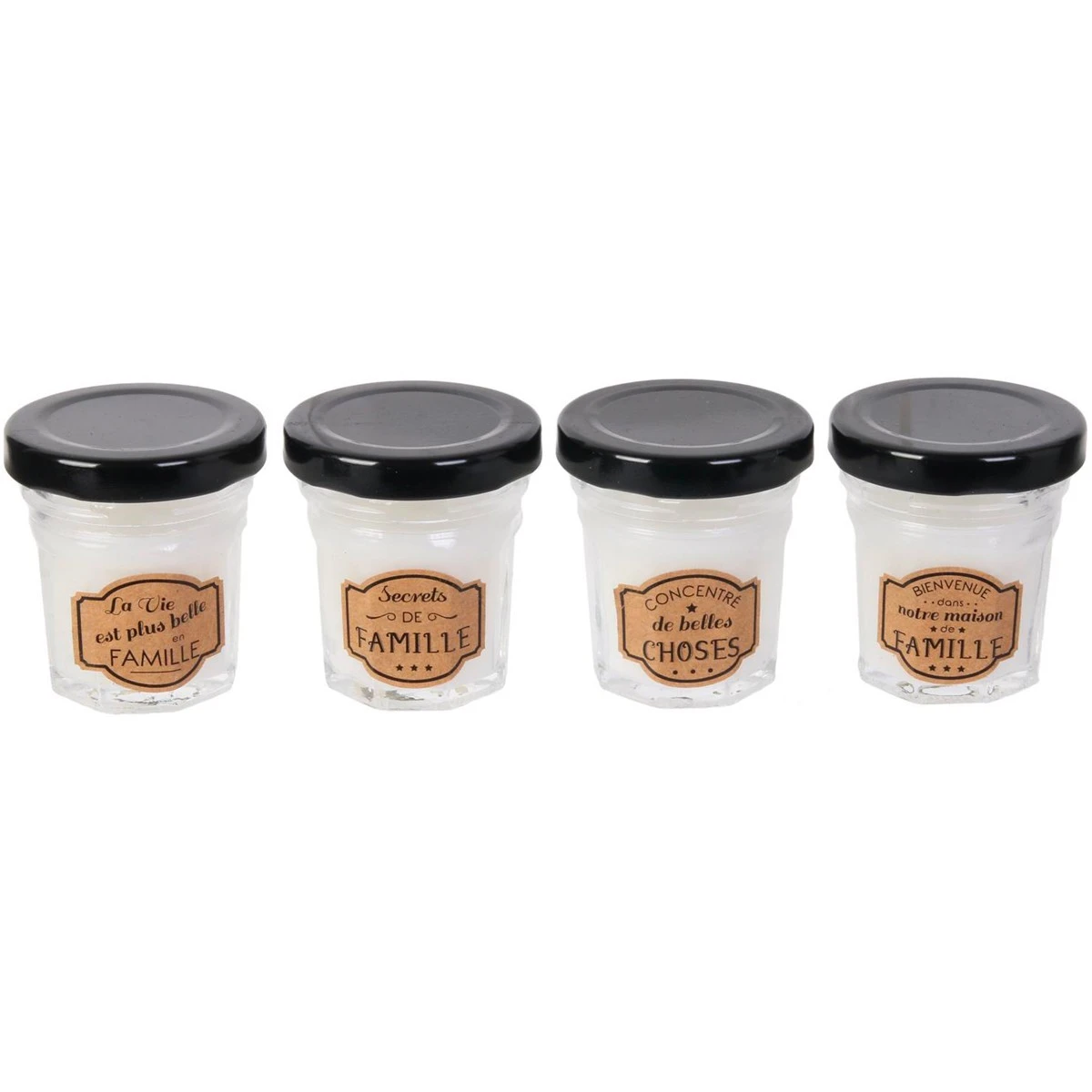 Cet élégant coffret noire aux allures de grimoire noire sur lequel il est inscrit « les règles de la maison de famille, Ranger ses affaires, être toujours de bonne humeur, être tolérant et bien vivre ensemble » renferme quatre petits en forme de mini pots de confiture. Les étiquettes comportent des inscriptions sur le thème de la famille comme « La vie est plus belle en famille » ou « bienvenue dans notre maison de famille ». Le est assurément un petit cadeau charmant et relaxant pour qui aime la vie en famille, un clin d’oeil aux liens forts qui unissent les membres d’une même famille.