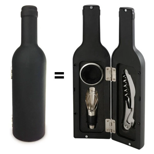 Un joli coffret en forme de bouteille qui abrite un tire-bouchon, un bec verseur et un col à bouteille anti goutte !