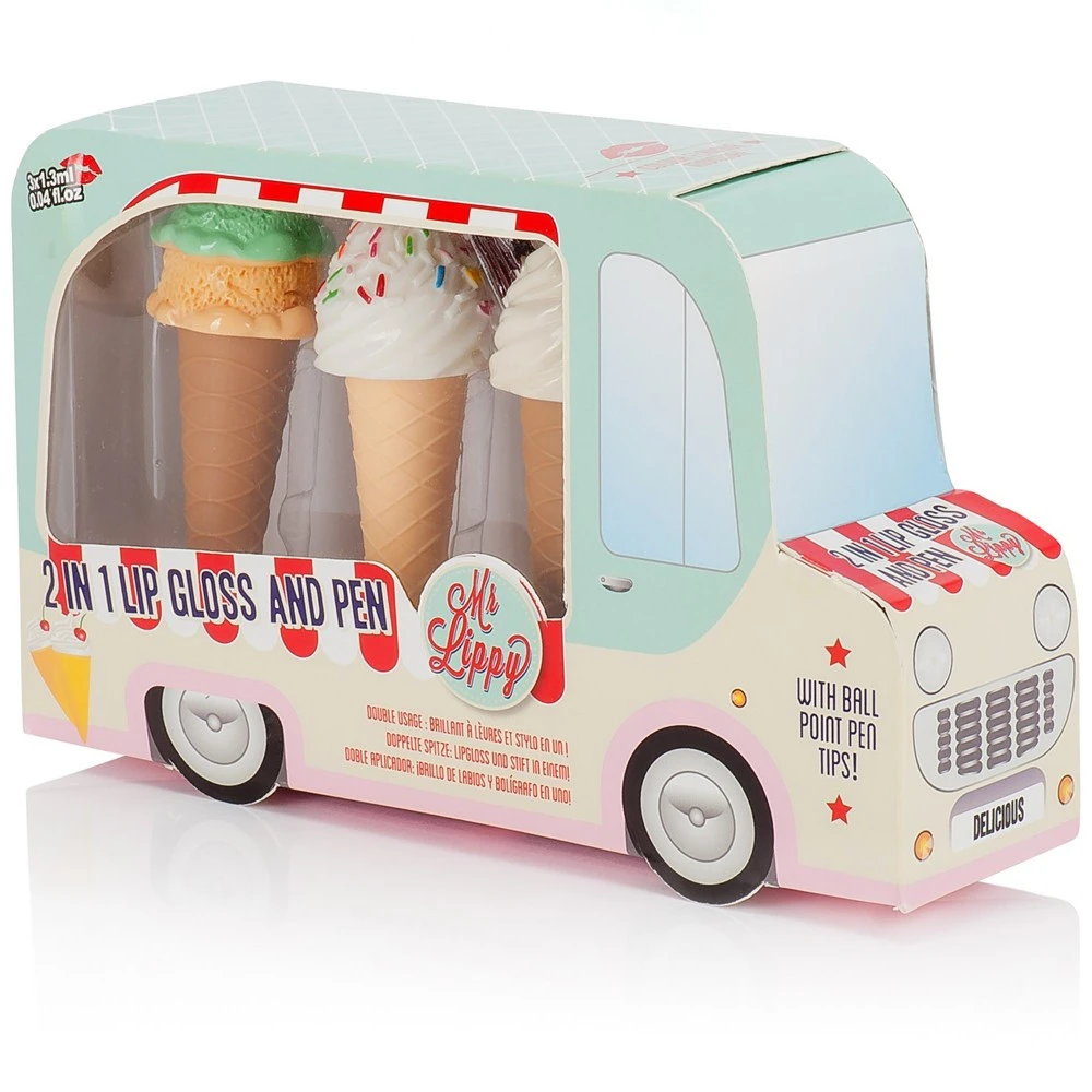 L’ensemble comprend dont la fonction est double : d’un côté et sous le capuchon. Nous sommes donc ici en présence d’un camion de « gloss » plutôt que d’un camion de glaces… Encore que nos amis du nord de la France ne décèleront pas forcément l’écart de phonétique (pardon ! 😉 ). Un cadeau terriblement girly et original.