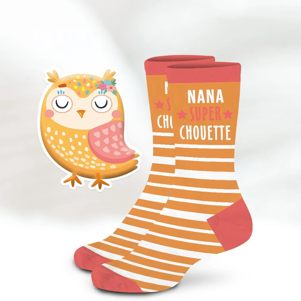 - Comprend une paire de chaussettes 100% coton avec l’inscription « Nana super Chouette ».