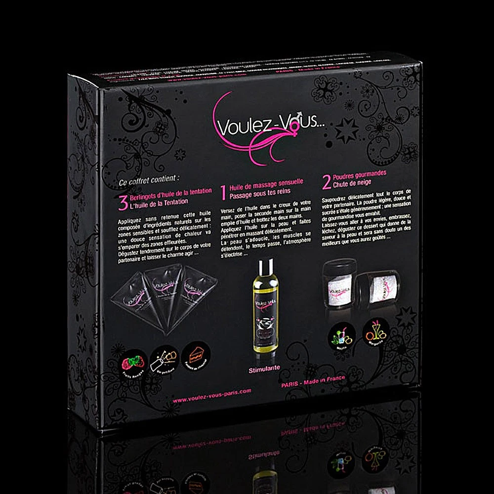 Voulez-Vous… partager un moment sensuel et exotique à deux ? Le coffret de massage exotique Voulez-Vous renferme tous les ingrédients pour découvrir et faire découvrir à votre partenaire des délices insoupçonnés.