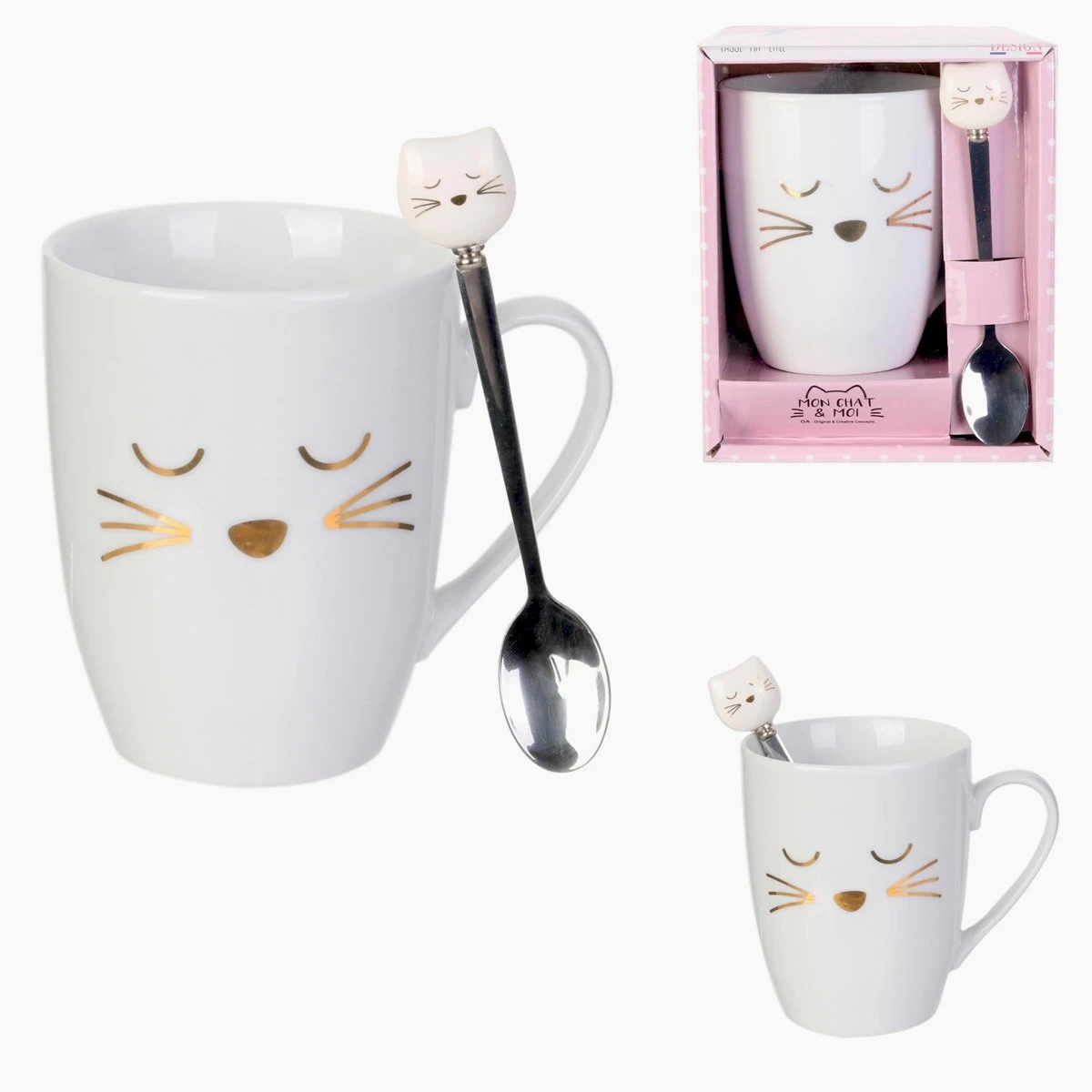 Ce joli coffret cadeau comprend une ravissante tasse sur laquelle est imprimée en dorure un adorable visage de chat. L’ensemble comprend également une cuillère assortie sur laquelle on retrouve le à l’extrémité. Ce joli cadeau « chat »leureux fera le bonheur des amateurs de thé et surtout de chats.