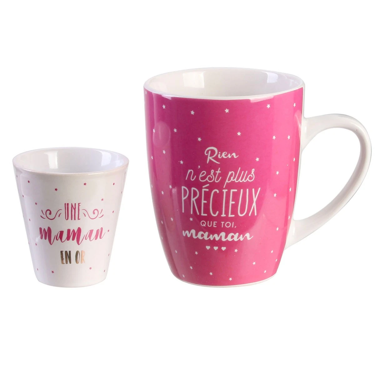 - Inscription Mug : « Rien n’est plus précieux que toi Maman » et sur la tasse espresso « Une Maman en Or ».