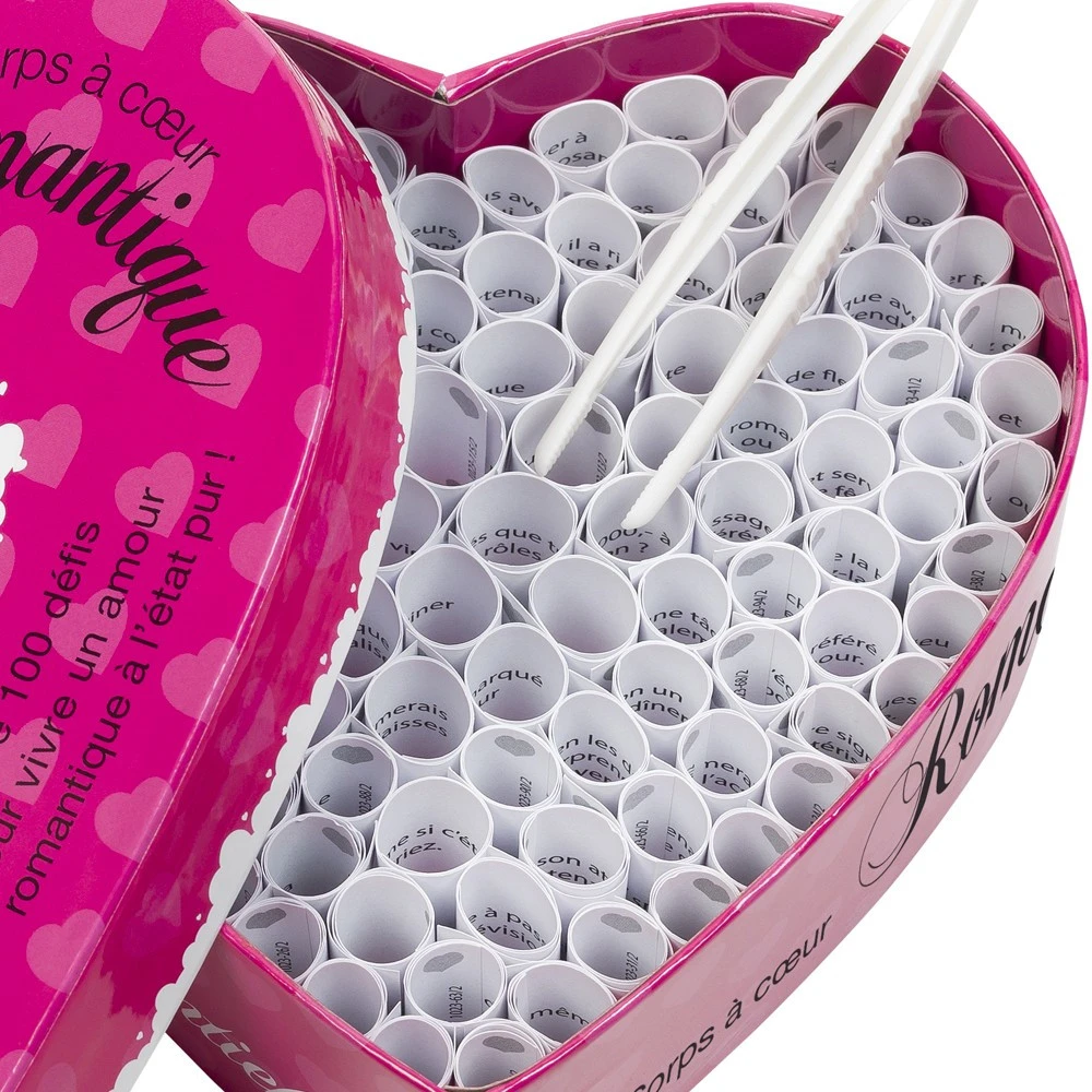 100 défis amoureux, passionnés, érotiques pour vivre un amour romantique à l’état pur ! est un jeu à deux très excitant pour consommer votre partenaire sans modération. Le bel ensemble se compose d’une jolie boîte en forme de coeur renfermant 100 petits parchemins. Saisissez à tour de rôle les petits papiers à l’aide de la pincette fournie, puis déroulez les pour en connaitre le gage. Par exemple « écrivez un mot d’amour à votre partenaire et donnez-le lui » ou « racontez-lui votre meilleur orgasme ». Plusieurs gages par jour ou un seul pour faire durer le plaisir, c’est à vous de choisir. Séduction ludique, préliminaires tendres, fantasmes coquins ou défi érotique ? ? Vivez un moment éro-mantique ensemble !