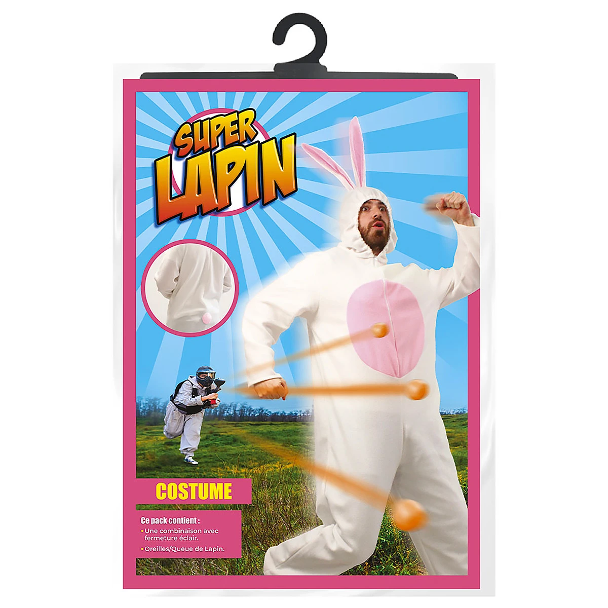 Préparez-vous à vivre des moments hilarants avec le déguisement , le choix parfait pour toutes vos activités festives et même… pour le paintball ! Que ce soit pour un EVG, un anniversaire, une soirée déguisée ou une partie de paintball entre amis, ce costume atypique vous garantit une expérience mémorable et pleine de fous rires. Enfilez cette combinaison blanche et rose pour vous transformer en véritable lapin guerrier. Grâce à la matière extensible, vous pourrez courir, sauter et vous faufiler partout tout en étant à l’aise. Les oreilles et la queue de lapin intégrés à la combinaison ne manqueront pas de rajouter une touche humoristique à votre look de combattant. Cette combinaison extensible est de taille unique, donc elle conviendra parfaitement à la plupart des morphologies. Imaginez les visages de vos adversaires lorsqu’ils vous verront débouler sur le terrain de paintball dans ce déguisement Super Lapin ! Non seulement vous serez la cible préférée de tous (chacun son délire !), mais vous créerez aussi une ambiance décalée et amusante qui rendra la partie inoubliable. La fermeture éclair facilite l’enfilage et le retrait de votre déguisement pour vous permettre de vous amuser en toute liberté. Mais le meilleur dans tout ça, c’est que vous pourrez enfin réaliser votre rêve : devenir un bon gros lapin survitaminé, et avec toutes les rumeurs qui courent sur les lapins, on peut le comprendre ! Alors, prêts à sauter dans la peau du lapin le plus fun et le plus original de la soirée ?
