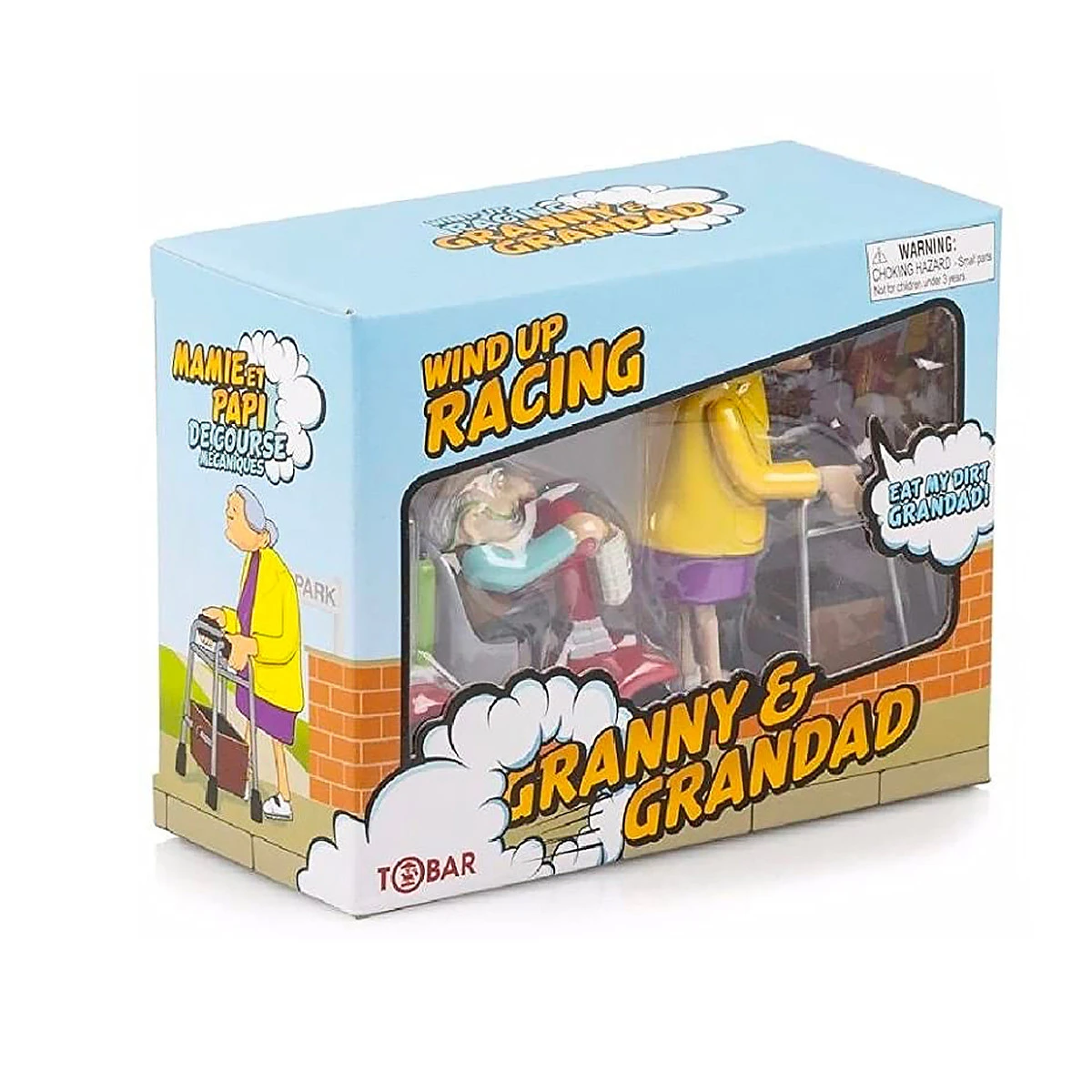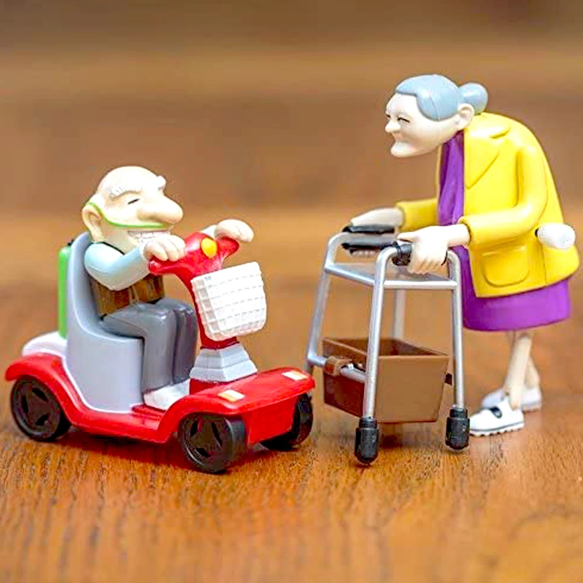 Vous l’aurez compris, l’ensemble est un clin d’œil humoristique à prendre au second degré à nos chères personnes âgées. Ces deux mignonnes figurines équipées d’un mécanisme font la course l’une contre l’autre. L’une pousse son déambulateur avec détermination, l’autre est dans son scooter de mobilité transformé pour l’occasion en dragster avec deux bouteilles de protoxyde d’azote dans le dos. Gare aux étincelles et adieu à la poussière ! ces papy et mamie là sont prêts à en découdre !