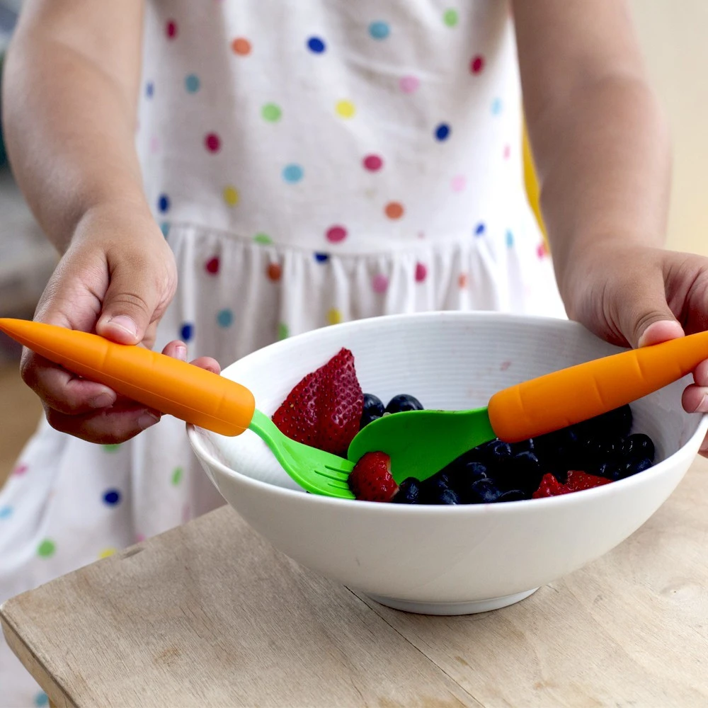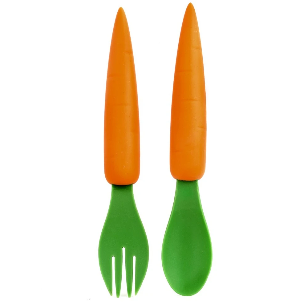 Les sont composés d’une fourchette et d’une cuillère avec un manche en forme de carottes. Il va sans dire que vous pourrez faire manger toute sorte de mets délicieux à vos enfants avec ces couverts carottes et pas seulement des carottes ! Vos bambins prendront plaisir à utiliser ces couverts amusants et agréables au toucher. Leur manche est en silicone et le plastique est alimentaire 100% sans bisphenol A ni PVC. Ils supportent le passage au lave-vaisselle. Un ensemble de couverts pour enfant amusant et recommandé pour un .