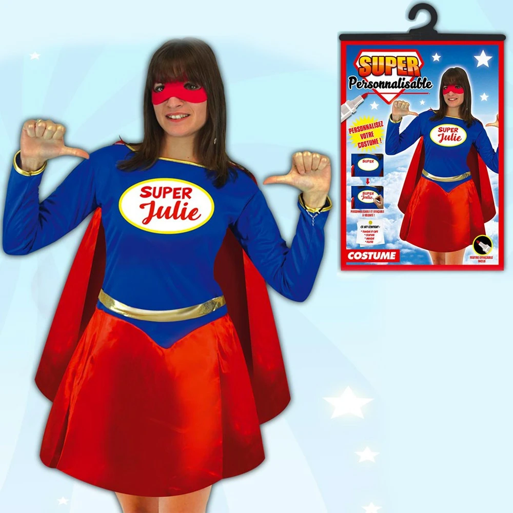 Cette originale, va révéler le meilleur ou le pire de ce qui se cache en vous. Un masque, une tunique, une cape et une ceinture c’est un bon début pour ressembler à une super-héroïne, mais quel genre de super-héroïne êtes vous ? Ce déguisement amusant est livré avec un feutre effaçable qui vous permettra de de votre costume. « Super Josette », « Super Gertrude », « Super Marie », si vous souhaitez ajouter simplement votre prénom par exemple. Vous pouvez aussi élargir le domaine du « Super » en ajoutant le mot de votre choix pour être décalé : « Super Courgette », « Super Gonzesse », « Super gentille »… etc… La partie centrale est effaçable et personnalisante à volonté au gré de vos humeurs !