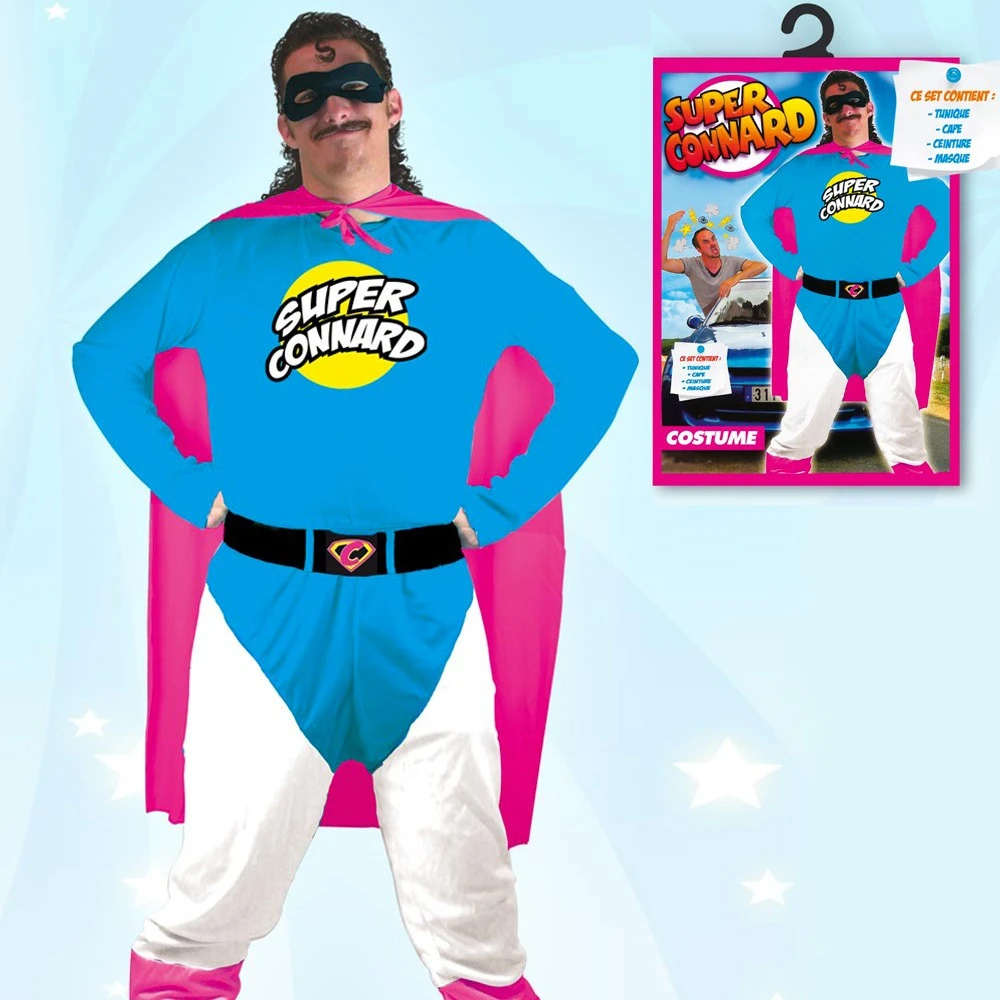 Le est le déguisement idéal pour un « connard » qui sait faire preuve d’auto-dérision (ou pas) et assume pleinement le fait d’en être un (ou pas). Une tunique sur laquelle il est inscrit « Super Connard », une ceinture, une cape et un masque, telle est composée cette panoplie avec laquelle vous deviendrez et susciterez l’hilarité de votre entourage (ou celui de celui à qui vous destinez ce costume) lors d’une soirée déguisée, du carnaval ou même d’un enterrement de vie de garçon. Rassurez-vous, il existe aussi une version Femme pour faire un couple idéal !