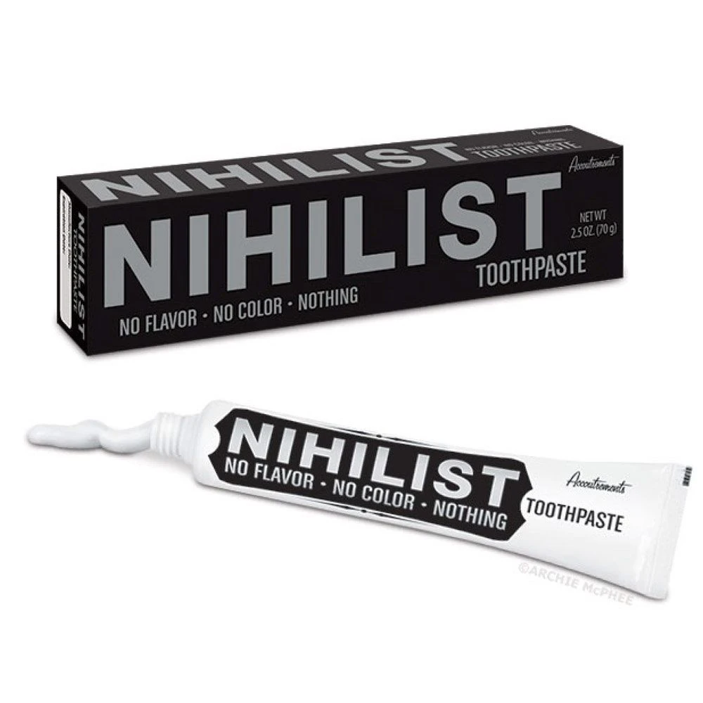 Le nihilisme est une philosophie dans laquelle le monde est dénué de tout sens, de tout but et de toute vérité. À l’extrême, les nihilistes ne croient en rien. Basé sur ce principe, voici le dentifrice pour nihilistes : il n’a aucun goût, aucune saveur, aucune couleur. Ici, point de rayures bariolées, de saveur mentholée, ou de blonde serrant une rose entre des dents étincelantes pour vous inciter à vous brosser les quenottes.