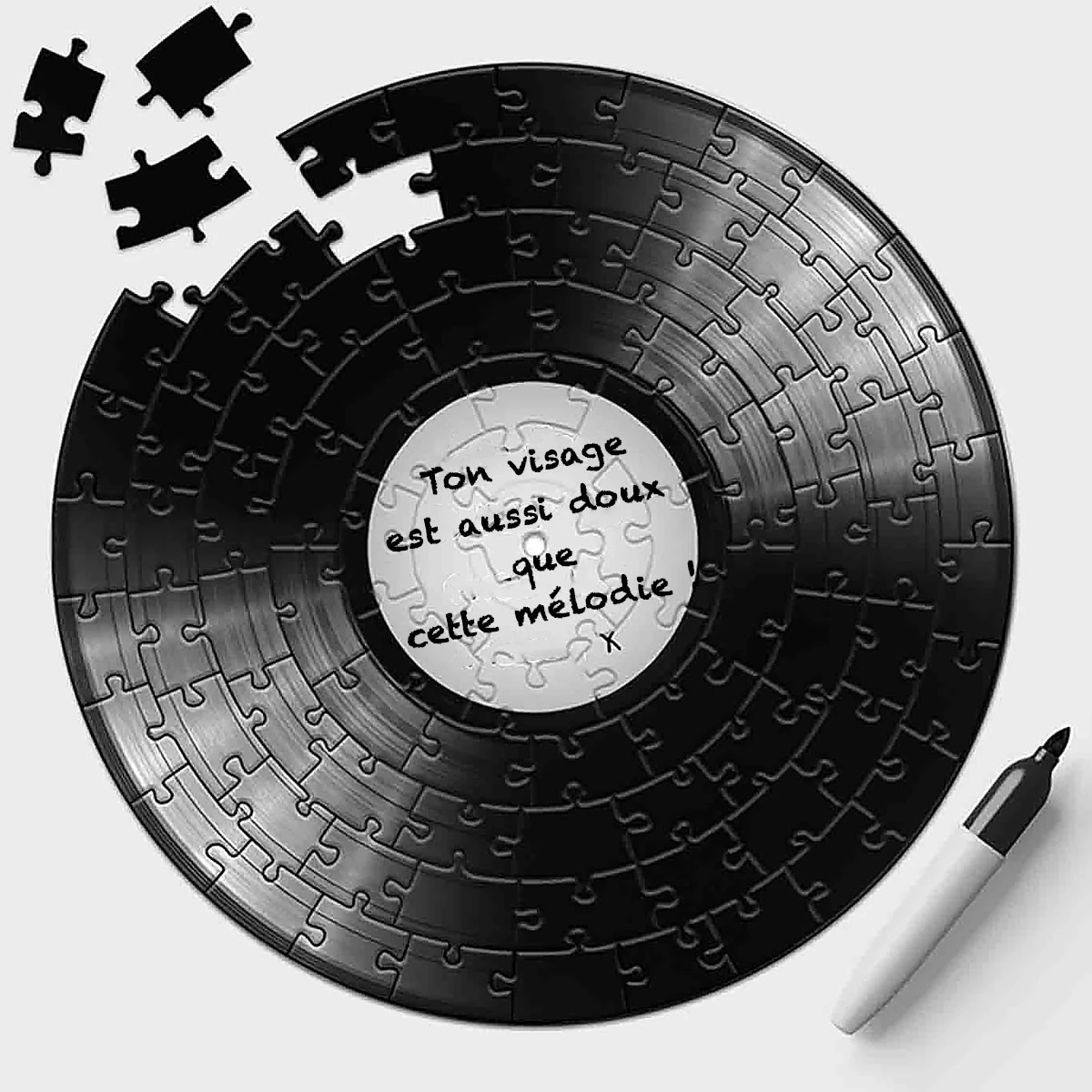 Offrez un cadeau ultra personnalisé avec cet astucieux puzzle sur lequel vous aurez pris soin d’écrire un petit message. Le puzzle est livré assemblé, il vous suffit d’utiliser un stylo ou un marqueur pour écrire votre message sur ce puzzle en forme de disque vinyl. Une fois rédigée, séparez les morceaux du puzzle et placez-le dans petit sac cadeau inclus en les mélangeant. Offrez le , et installez-vous confortablement pendant que la personne à qui vous l’avez offert assemble les 91 pièces du puzzle. Un cadeau touchant et particulièrement original qui surprendra !