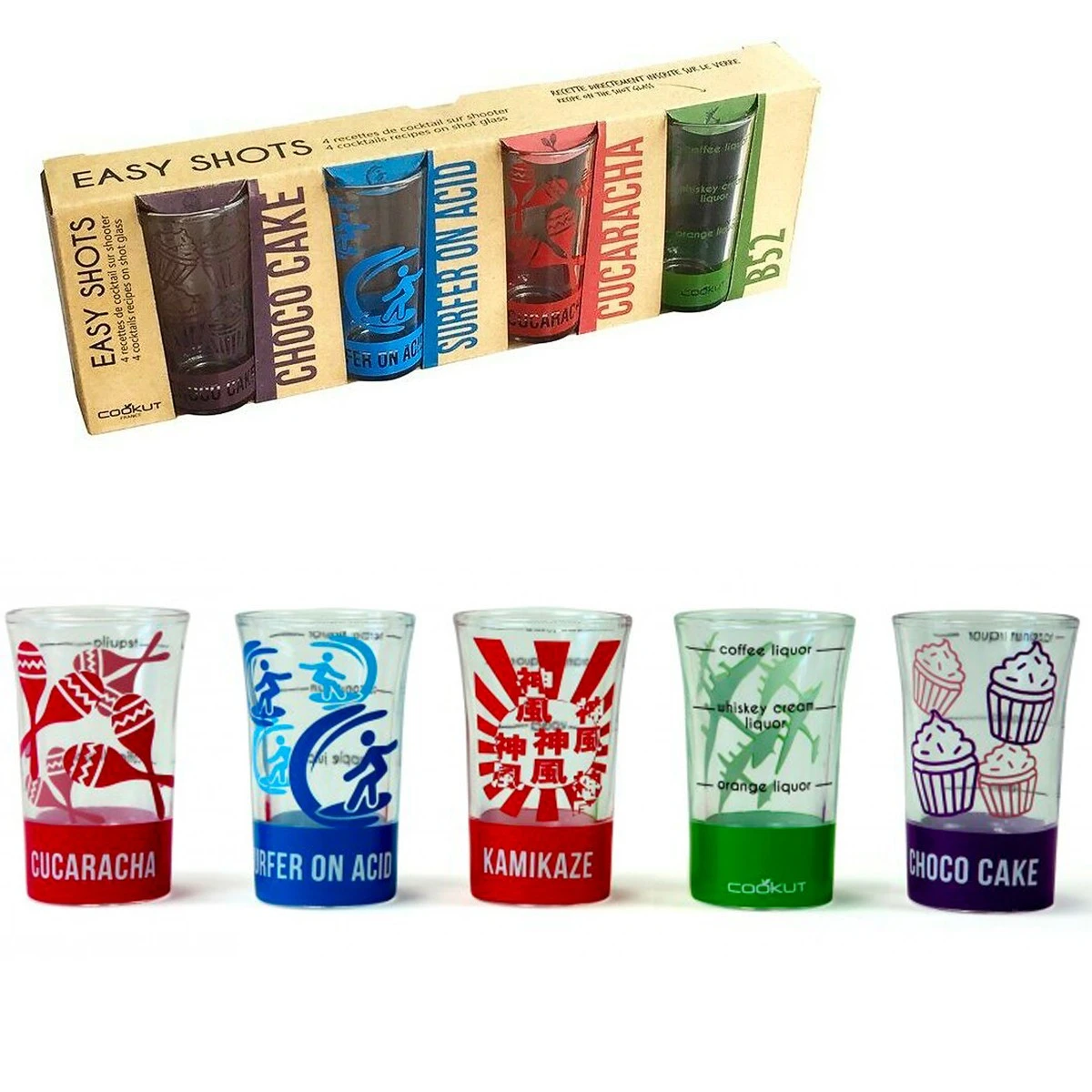 Cet ensemble comprend ou verres à liqueurs qu’il vous suffit de verser dans le verre jusqu’au niveau requis. Les quatre verres sont de couleurs différentes et comprennent chacun une recette différente. Choco Cake, B52, Surfer on Acid ou Cucaracha, tels sont les cocktails musclés que vous pourrez réaliser avec ce coffret cadeau. est un cadeau parfait à offrir à une personne qui apprécie les cocktails (avec modération).