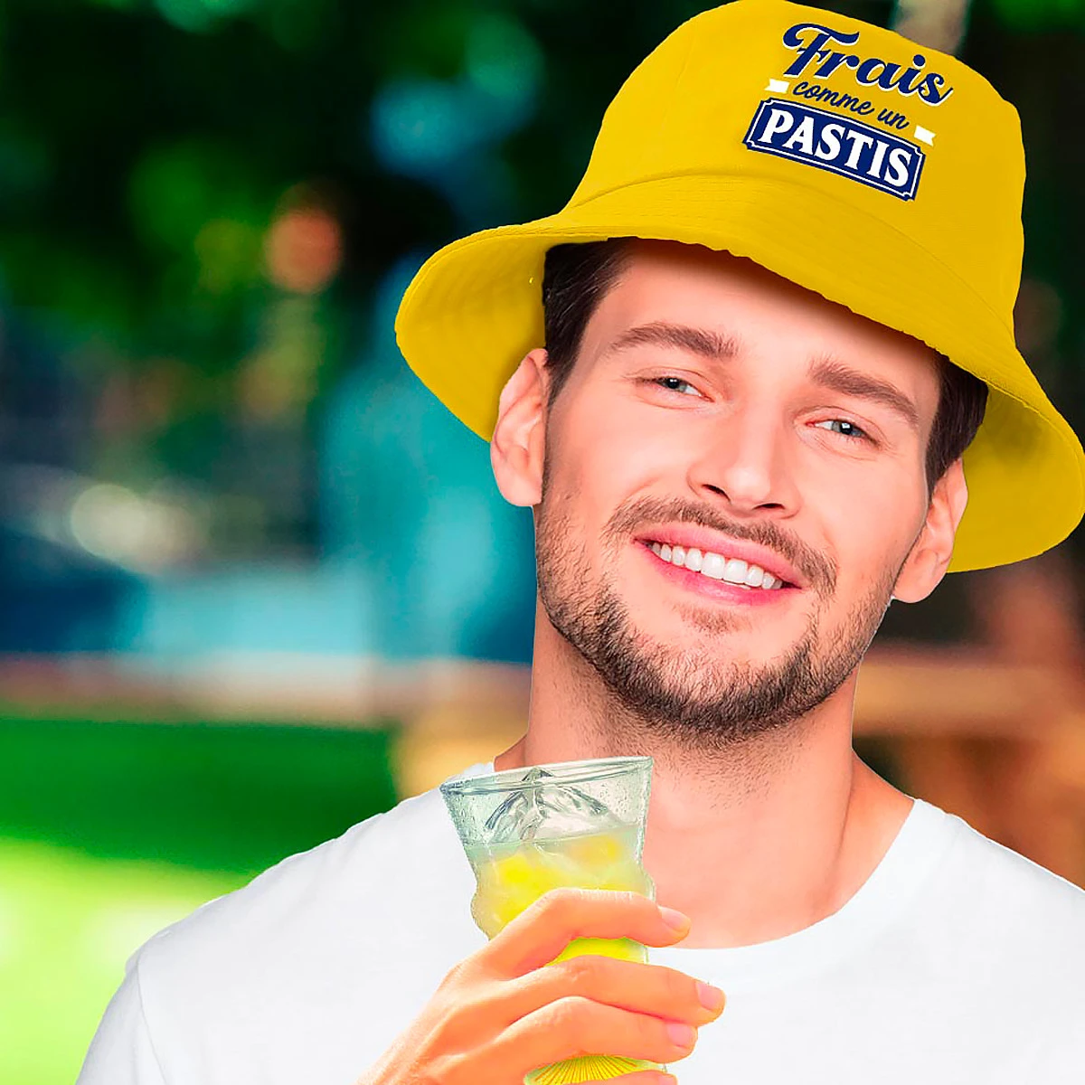 - Bob « Frais comme un Pastis » : coloris jaune, taille unique pour adulte, diamètre haut 15,5 cm, longueur bas plié 34 cm,