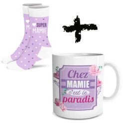 L’comprend un mug et une paire de chaussettes personnalisés et dédiés à votre Mamie si gentille ! Un joli mug en céramique sur lequel il est inscrit la mention : « Chez Mamie c’est le paradis ! » sur les deux faces. L’ensemble comprend également une paire de chaussettes couleur lavande parsemée de coeurs avec l’inscription « Super Mamie ». Un cadeau amusant et utile bien mérité pour votre Mamie qui vous aime tant. Vous pouvez avoir la certitude que votre grand-mère va adorer ce cadeau qui lui est dédié et qu’elle pensera à vous à chaque utilisation !