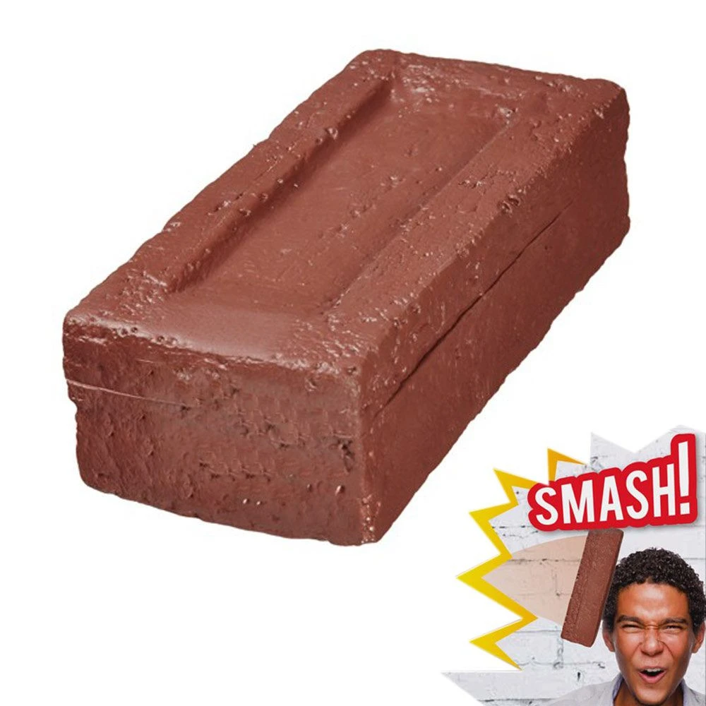 Fabriquée en mousse, la fausse brique sonore est saisissante de réalisme. Amusant, pour parfaire son imitation, la fausse brique émet un bruit de verre cassé lors qu’elle heurte le sol, un mur ou la tête de votre belle-mère !
