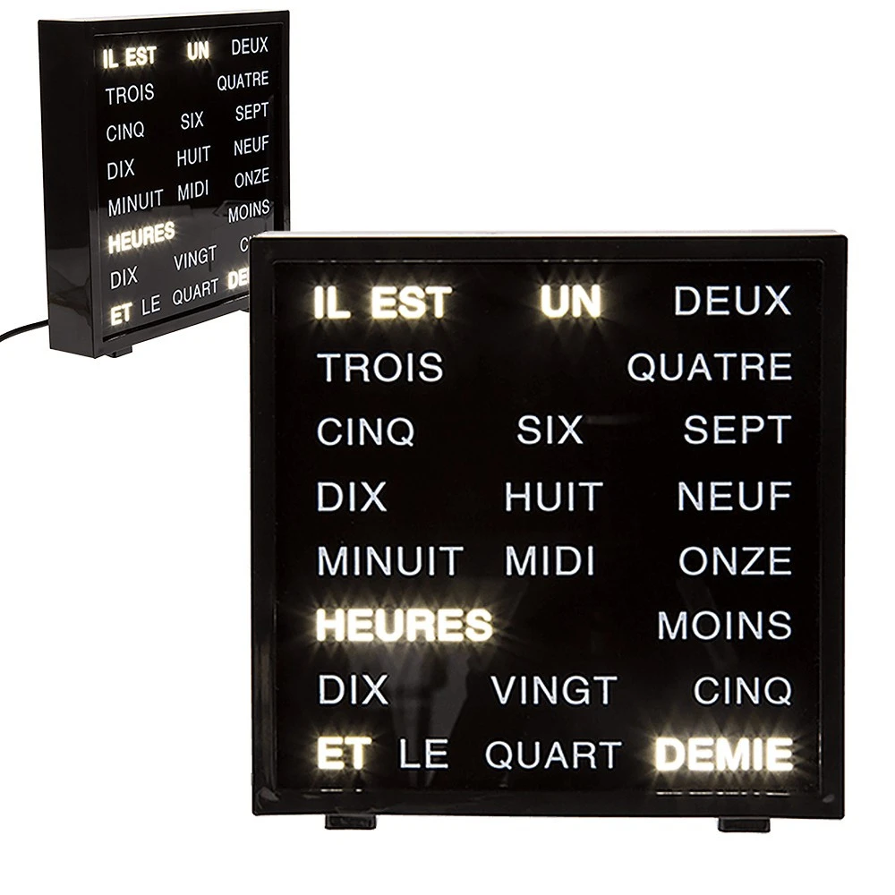 Infiniment plus originale qu’un cadran à aiguilles, l’ illumine chaque mot qui compose l’heure qu’il est au moment où vous la lisez. Cette horloge vous parle d’une manière littéraire et pas mathématique. Extrêmement , l’horloge à mots LED peut être posée sur un meuble de votre choix ou accrochée au mur. Cette pendule d’un nouveau genre suscitera la curiosité de votre entourage tant . C’est l’horloge des gens qui ont cinq minutes et pour qui le temps s’égrenne avec passion tout au long de la journée. Cette horloge originale ne vous met pas la pression, l’heure change toutes les cinq minutes et utilise votre langage avec les mots que vous utilisez pour donner l’heure : « Il est deux heures et demie », « Il est midi moins vingt cinq ». Un particulièrement insolite.