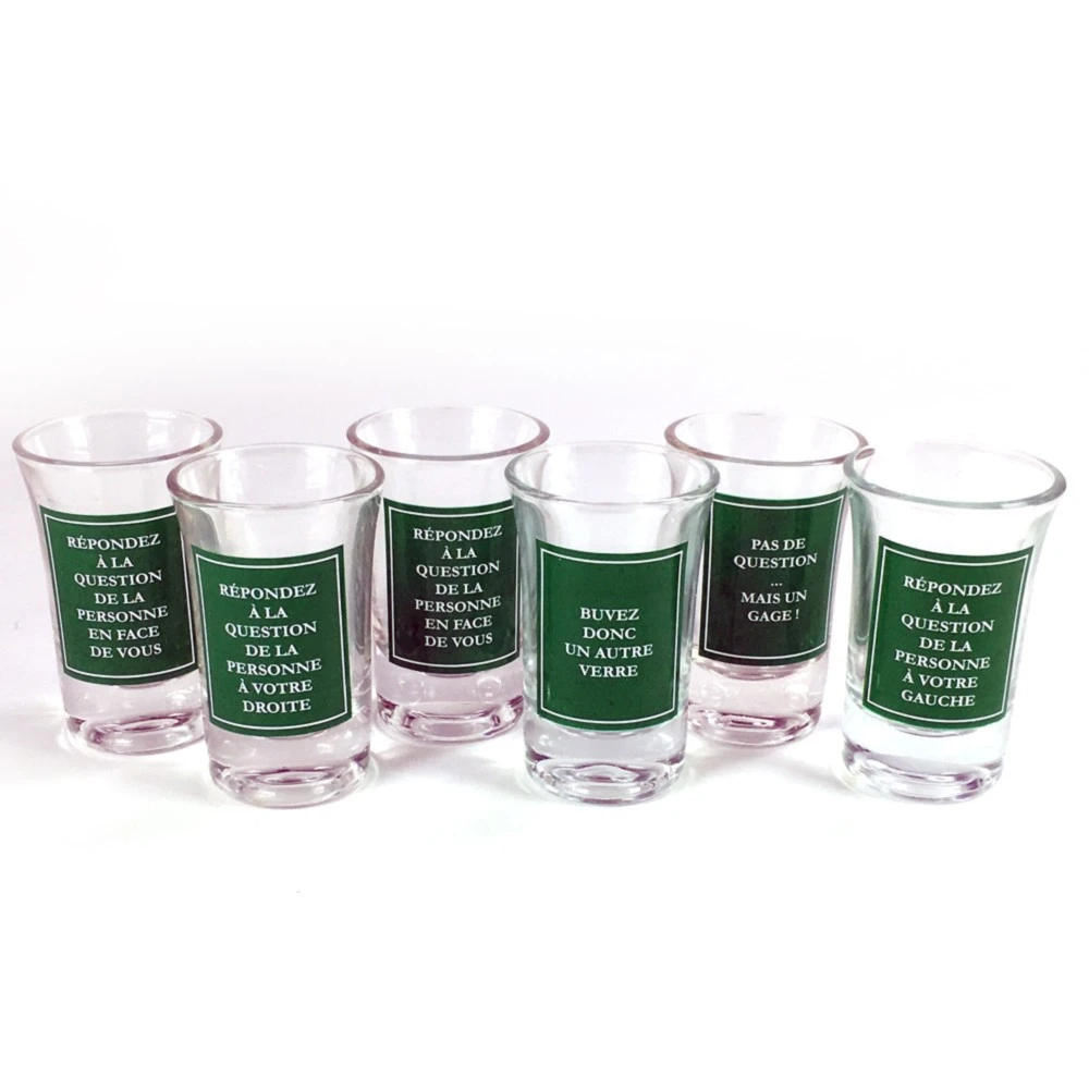 - 6 verres à liqueur humoristiques avec des instructions à effectuer,