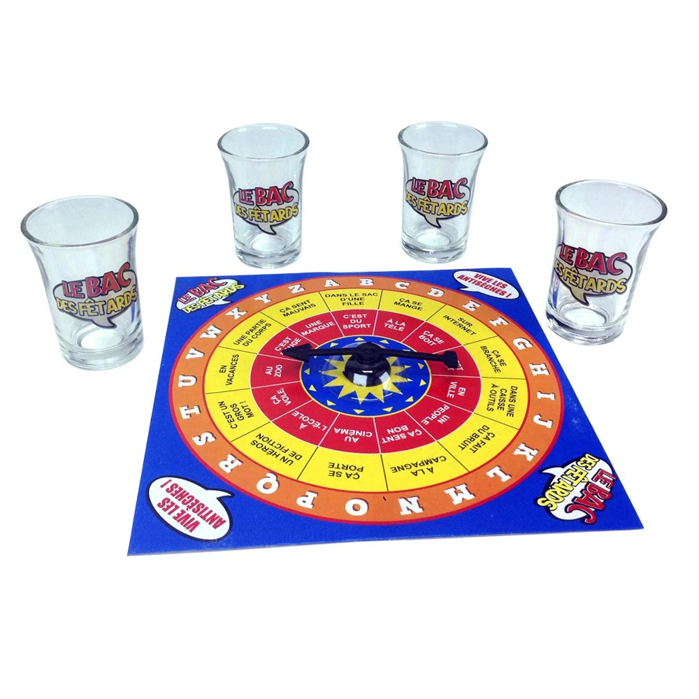 Voici une variante originale, le Jeu à boire le Bac des Fêtards. Chaque joueur remplit son verre de la boisson de son choix. Le premier joueur fait tourner la flèche pour désigner un thème puis fait tourner la flèche une deuxième fois pour désigner une lettre . Par exemple, la lettre « P » avec le thème « ça se porte », vous pouvez répondre « Pantalon ». Le gagnant marque 1 points et les autres boivent leur verre ! Simple et hilarant, ce jeu est un hymne à l’humour et il permet à tous de participer dans la joie et la bonne humeur. Des pénalités sont données pour agrémenter le jeu : celui qui donne une mauvaise réponse doit boire… etc…