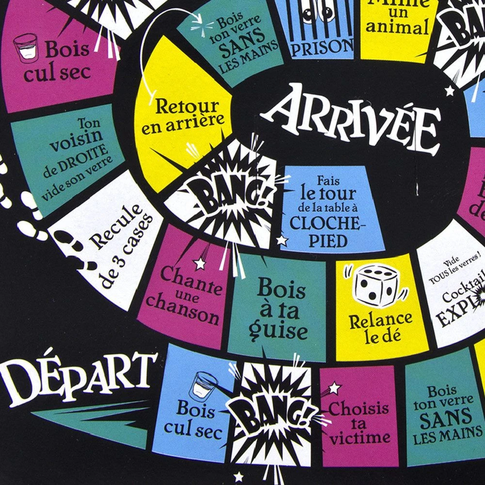 Si petit vous adoriez le jeu de l’oie, alors vous allez adorer Jeu à boire parcours infernal ! Un plateau de jeu, quatre verres, quatre pions et un dé, vous voila prêt pour une soirée à l’ambiance survoltée !