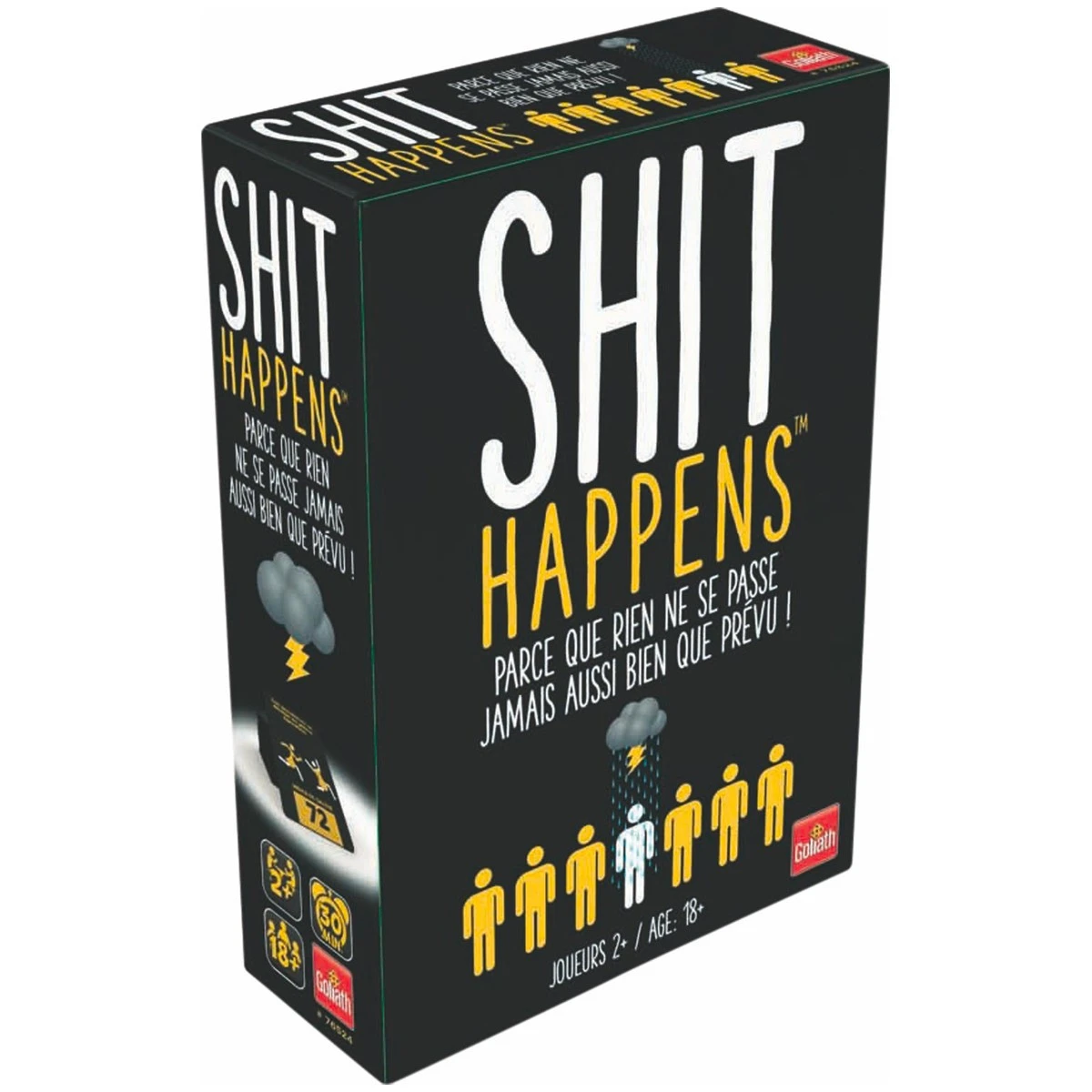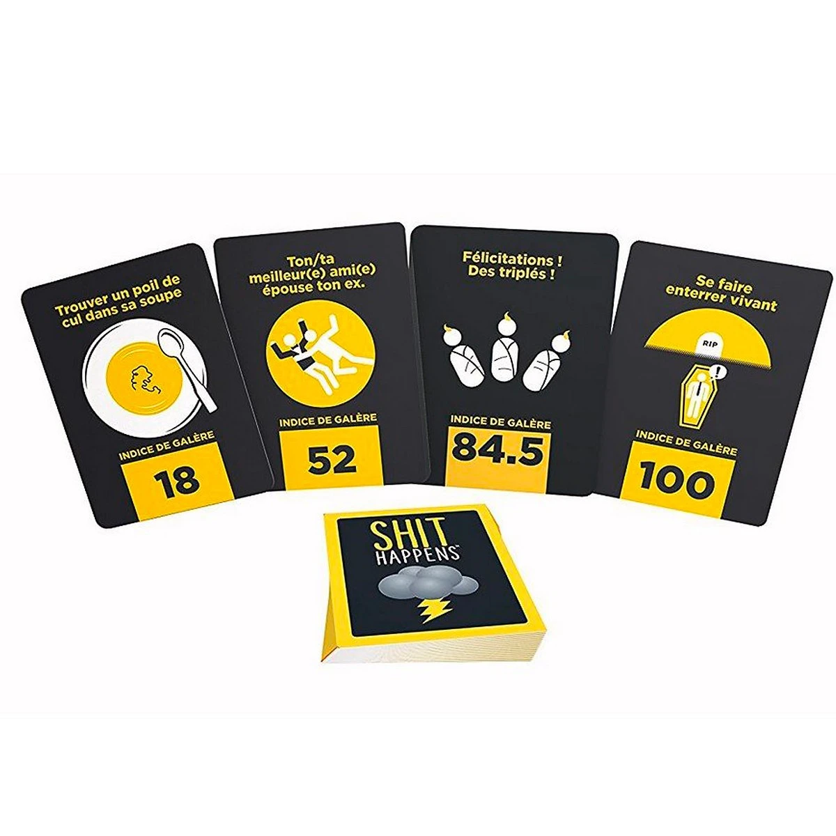 est un jeu croustillant et politiquement incorrect qui vous garantit des moments de fou-rires entre amis. Le but du jeu est simple : collecter un total de 10 cartes . Au début, chaque joueur pioche trois cartes et les place devant lui dans l’ordre croissant de valeur afin de commencer à composer votre indice de galère ou « shit-o-mètre ». Le joueur qui est le plus poissard du groupe pioche alors une nouvelle carte pour son voisin de gauche et la lui montre en prenant soin de cacher sa valeur. Pour la gagner, celui-ci doit deviner dans quel intervalle il pourrait la placer sur son shit-o-mètre. Par exemple, où placeriez-vous sur votre indice de « shit-o-mètre » gradué de zéro à cent la carte « Tu tombes sur la Sextape de tes parents » entre « Relation sexuelle non consentie avec un ours », « Chiasse fulgurante » et « Ton meilleur ami épouse ton ex » ? Le , c’est 200 mises en situation d’un quotidien dramatique, hilarant, improbable et impertinent. Des parties délirantes où le fou-rire sera de rigueur.
