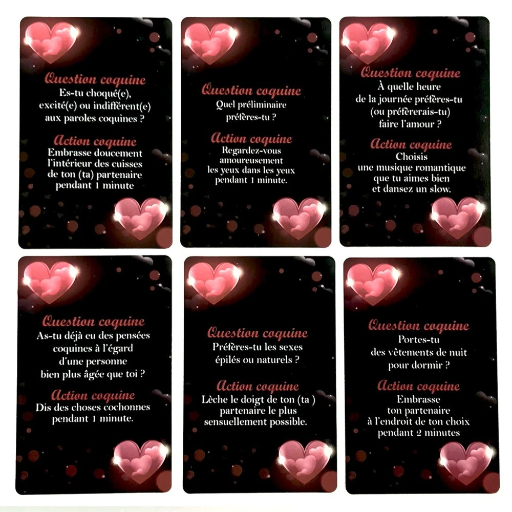 est un qui comprend 54 cartes. Chacune des cartes comprend une action « Hot » à réaliser ou une question « Osée » à laquelle il faut répondre. Chaque joueur tire une carte au hasard et choisit de répondre ou d’agir mais ne peut pas se défiler. Vous avez toujours rêvé de connaître ses préférences dans l’intimité ? Répondez ensemble aux questions coquines et faites les gages érotiques ! Le jeu Love Quizz comme jamais !