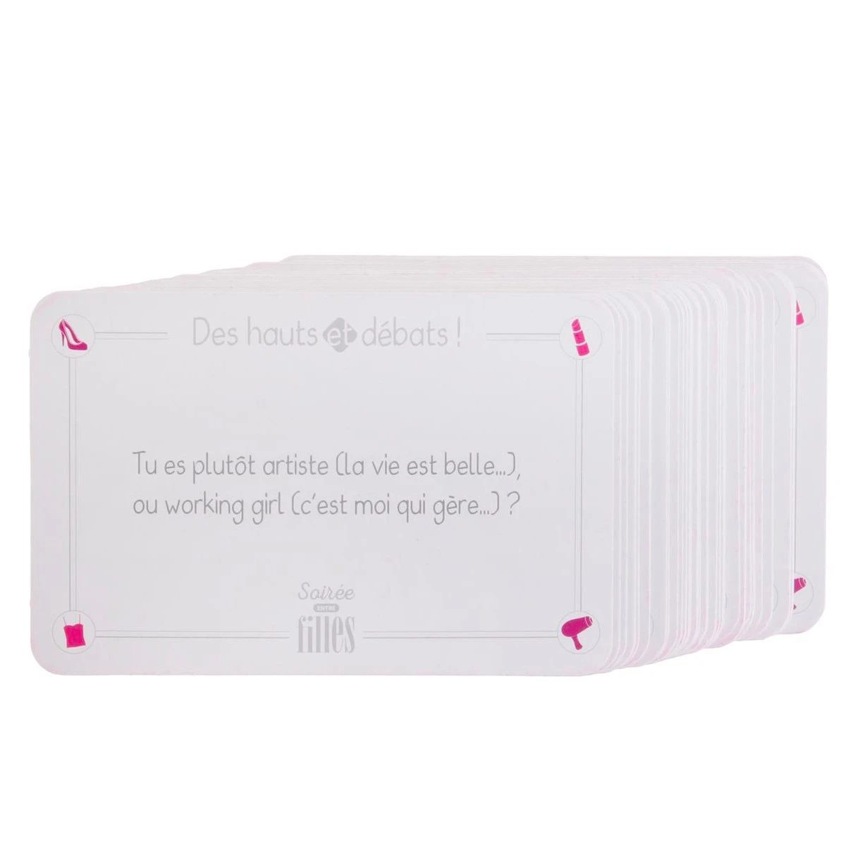 Comment jouer ? c’est simplissime ! Chaque joueuse tire une carte à tour de rôle et répond à la question inscrite sur la carte. Des questions hilarantes pour lancer des débats animés ou des moments de rigolades lors de dîners ou soirées entre filles. Le est un moyen amusant et pas cher pour se faire de nouvelles amies dans la bonne humeur ! Questions types : « le prince charmant ? tu y crois vraiment ? », « Pèter au lit avec lui ? C’est oui ? », « quel est le fantasme que tu aurais du mal à avouer ? ».