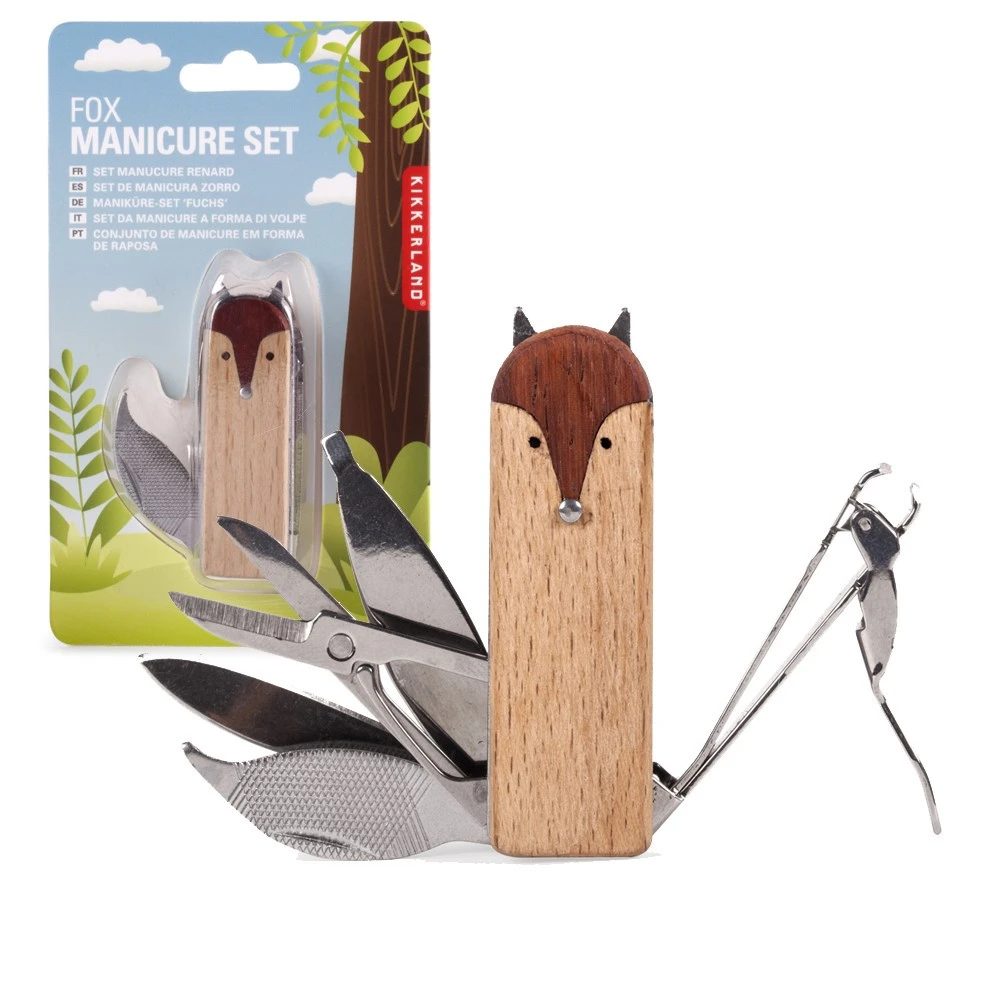 Ce bel objet dont le manche en hêtre massif renforce l’aspect qualitatif vous rendra bien des services lors du soin apporté à vos mains. Son design évoque volontairement le renard, animal connu pour sa ruse et les astuces dont il est capable pour arriver à ses fins. Le vous offre : canif, repoussoir à cuticules, lime à ongles, ciseaux et pince à ongles. Le combo parfait pour avoir toujours de belles mains soignées en toutes circonstances. Compact et inoxydable, vous pourrez emporter votre petit renard n’importe où !