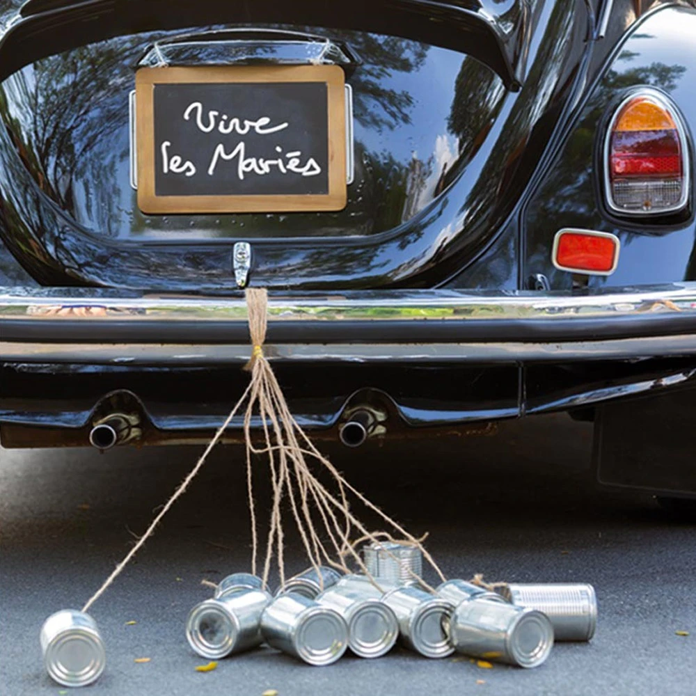 Traditionnellement utilisées pour faire et porter bonheur lors d’une noce en produisant énormément de bruit, les boîtes de conserve attachées derrière la voiture des jeunes mariés ne le sont plus par simple superstition. Il est en effet amusant de voir la s’éloigner avec un chapelet de boîtes de conserve attachées à l’arrière de la voiture. Les passants peuvent se retourner et acclamer ainsi les amoureux qui viennent de célébrer leur union en leur souhaitant beaucoup de bonheur. Le comprend tout le nécessaire pour fabriquer rapidement un joli qui feront beaucoup de bruit lorsqu’elle seront traînées sur la route ! cinq boîtes de conserve pré-percées sur lesquelles il est inscrit « vive les mariés ». La ficelle est fournie ! un cadeau amusant pour démarrer une vie de jeune marié dans un tintamarre de folie !