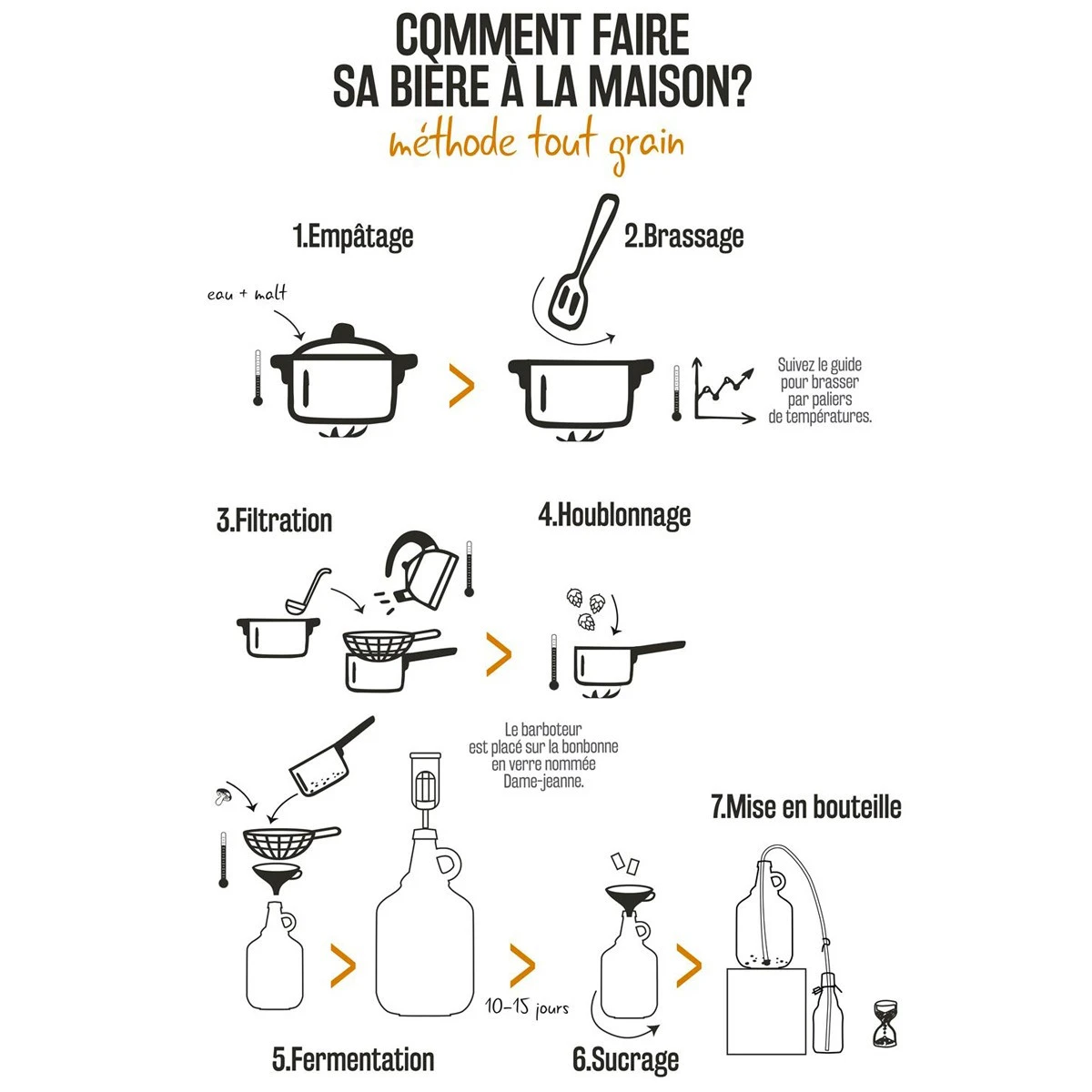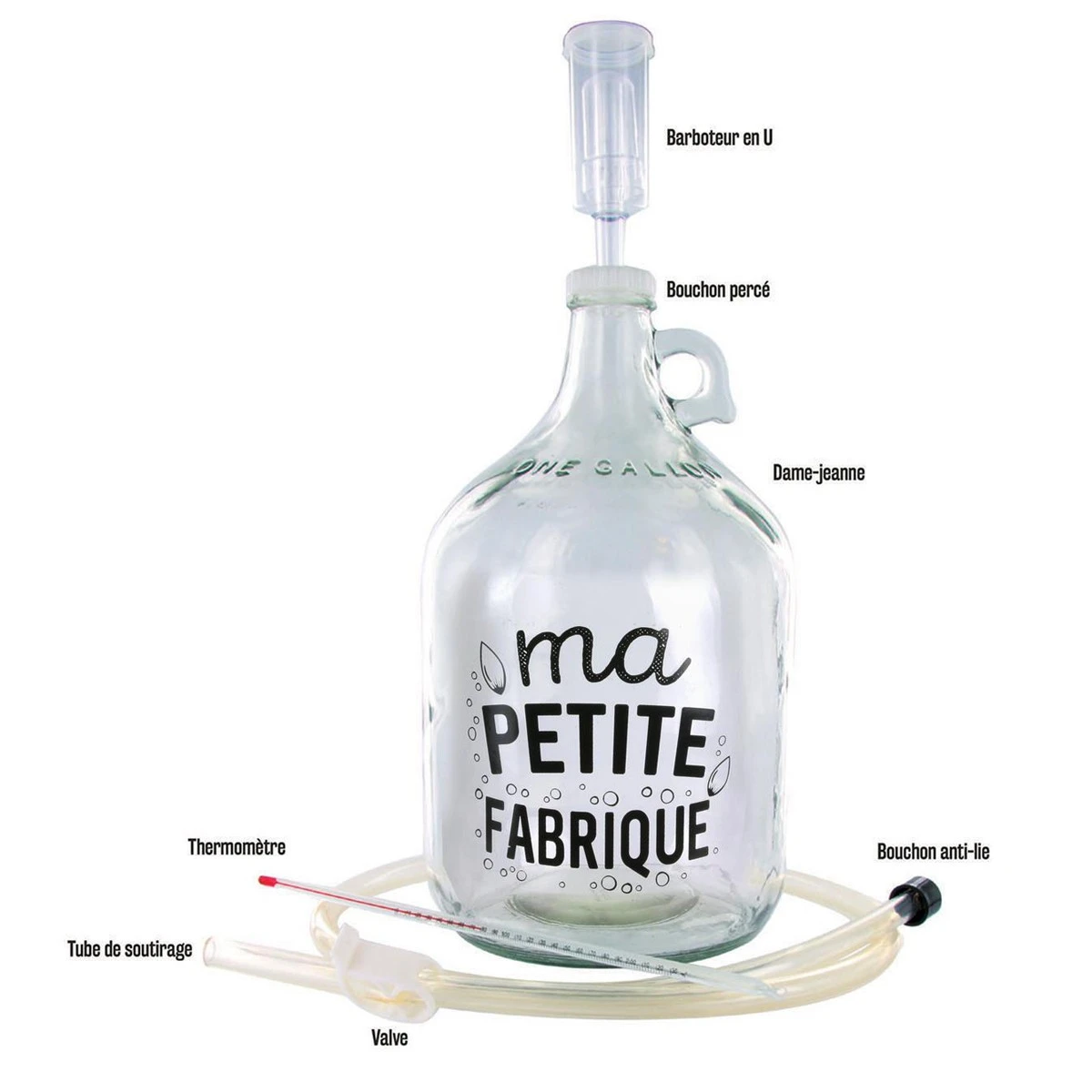 - contient le matériel de brassage pour concocter 3,7 litres de bière : 1 dame-Jeanne (bonbonne en verre de 1 gallon), bouchon percé et barboteur en U, thermomètre en verre, système de soutirage avec anti-lie et valve, notice et méthode détaillée (tout grain),
