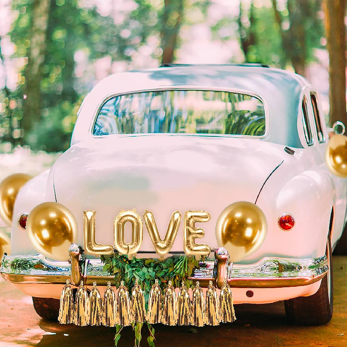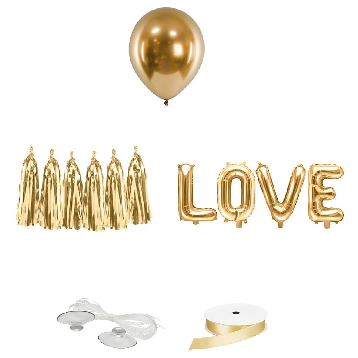 - Kit comprenant 1 guirlande « love » dorée, 1 guirlande à pompons dorées, 6 ballons dorés de 23 cm de diamètre, 1 ruban doré de 25 cm, 1 fil de pêche de 12 cm et 2 ventouses.