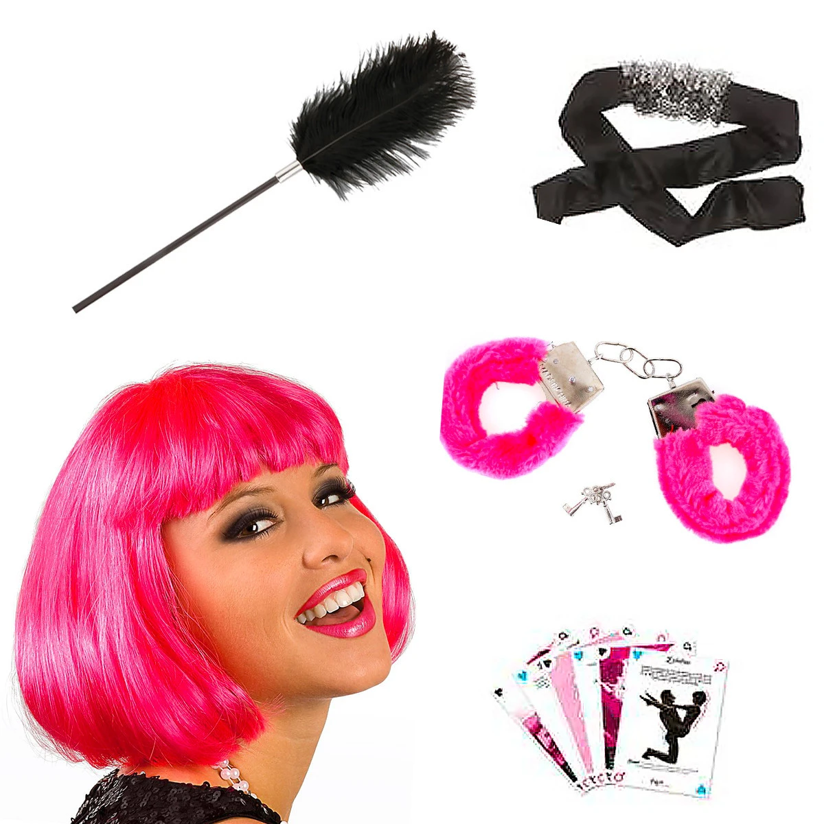 - contient 5 objets coquins : une perruque rose, un bandeau satin et dentelle pour les yeux, une plume pour chatouiller, des menottes et un jeu de cartes coquin (positions et lieux insolites),