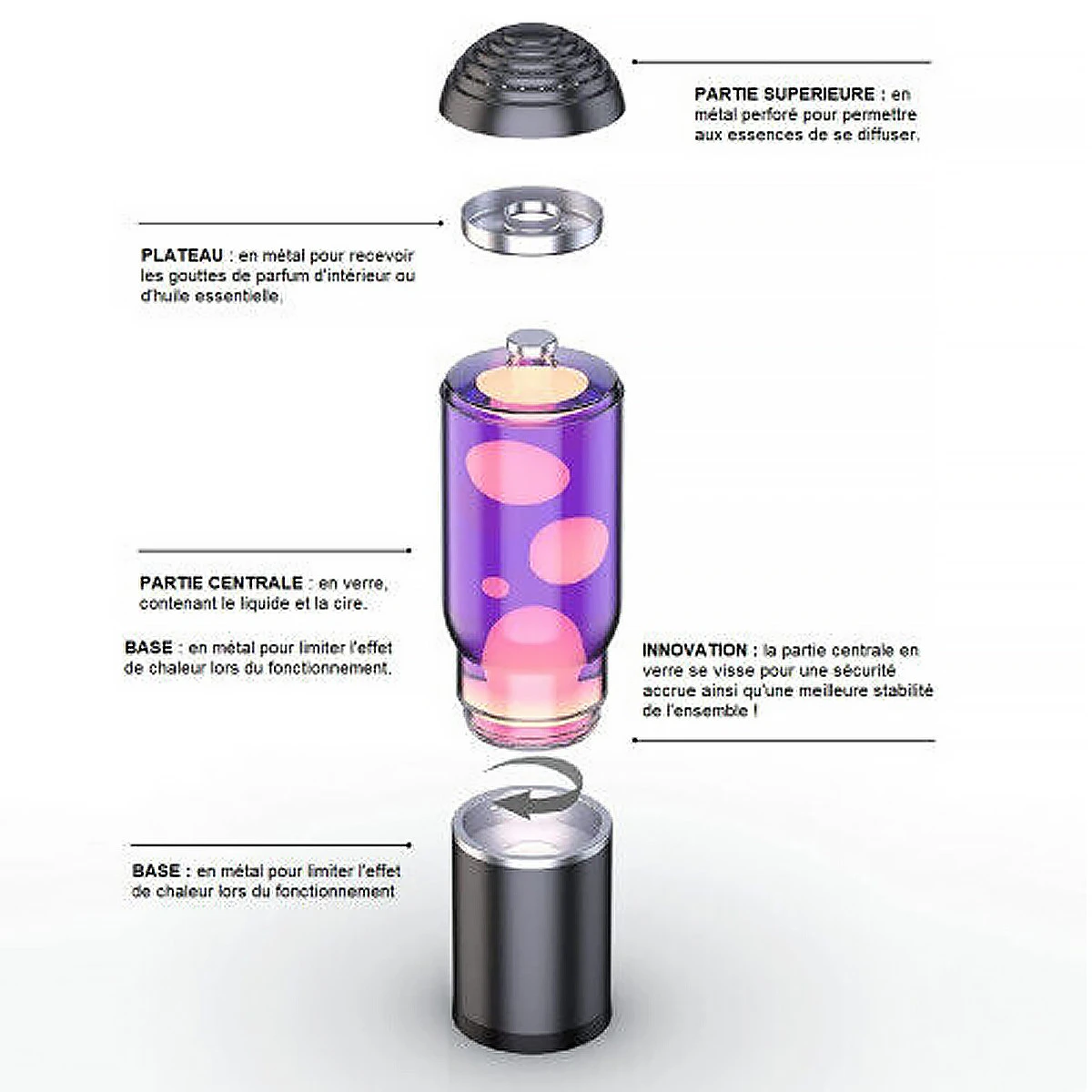 - Lampe à lave et diffuseur de parfum, le tout en un ! A la fois lampe d’ambiance et diffuseur d’aromathérapie,