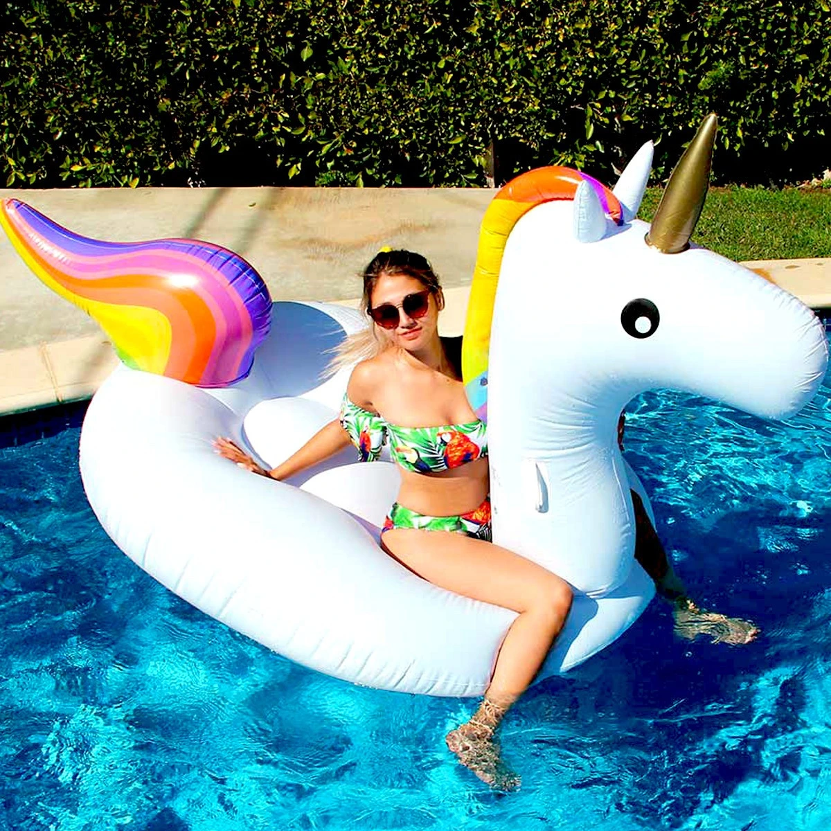 Les baignades sont plus magiques avec les licornes ! La vous offre 2,75 m de croupe sur laquelle vous allonger pour faire une sieste miraculeuse au gré des clapotis de l’eau. Certes, notre licorne n’est pas une vraie licorne, mais en tous cas la nôtre flotte ! ce que personne n’a encore pu vérifier avec une vraie licorne puisque les vraies licornes se font aussi rares que le monstre du Loch Ness. 2,75 m de long, 1,40 m de large et 1,20 m de hauteur, des pour accueillir des humains jusqu’à 100 kgs ! Le chevauchement de la bête à corne est plutôt confortable d’autant que vous disposez de pour vous accrocher au cou de la licorne en cas de ruade intempestive. Il ne vous reste plus qu’à engager une calvalcade aquatique qui devrait vous donner encore plus de bonheur : c’est l’effet licorne.