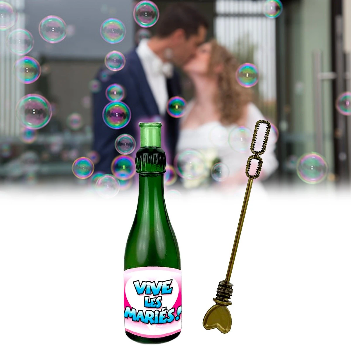 Cet ensemble festif comprend en effet douze petites bouteilles en forme de bouteille de Champagne contenant du liquide à bulles de savon. Sur chaque bouteille il est inscrit « Vive les mariés ! » et le bouchon est en forme de coeur ! lors d’un mariage, offrez à chacun de vos invités une , ils seront ravis de diffuser des milliers de bulles de savon en l’honneur des mariés à la sortie de l’église ou de la mairie. Un mariage est un moment magique et les bulles de savon font bien plus d’effet visuel que les grains de riz (et moins mal 😉 ).