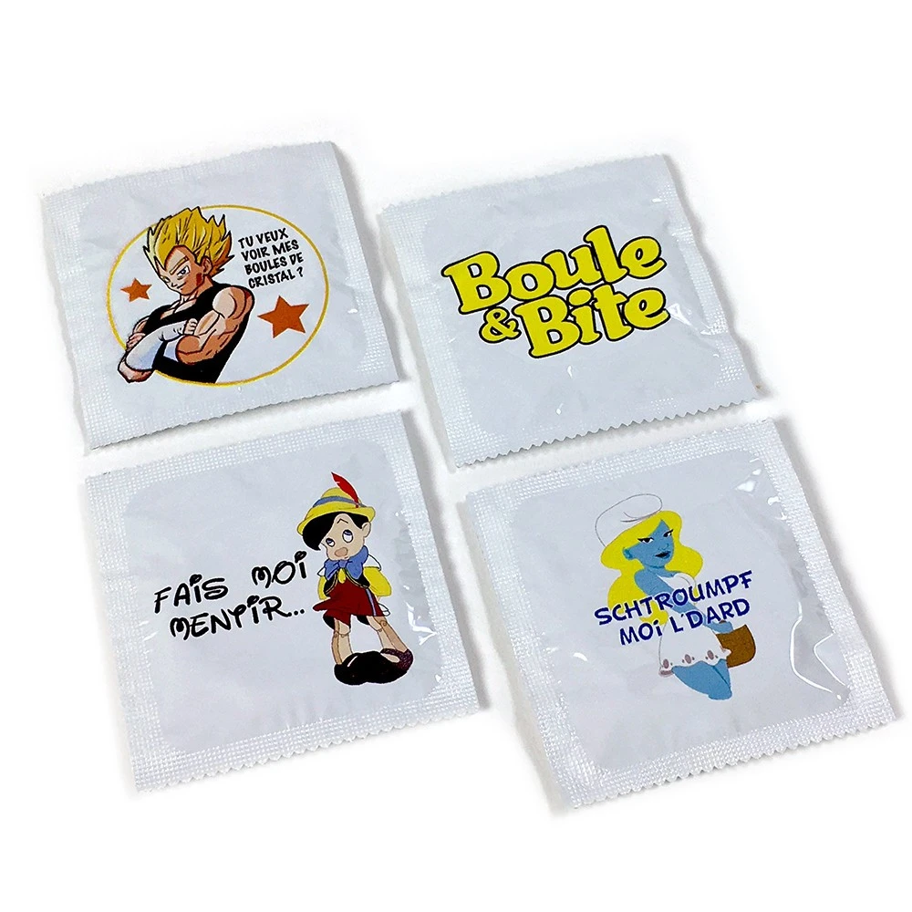 - Vendu en lot de 4 préservatifs : « Fais moi mentir », « Schtroumpf-moi l’dard », « Tu veux voir mes boules de cristal ? », « Boule & Bite ».