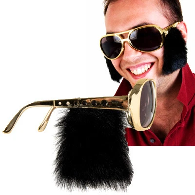 Love me tender… never let me goooo… Fans du King Elvis Presley, voici de quoi vous combler avec nos superbes lunettes du king ! leur splendide monture en plastique doré fait pâlir de jalousie les opticiens et surtout ! …surtout, elles arborent de magnifiques rouflaquettes en « moumoute » synthétique, signe distinctif caractérisant le célèbre chanteur. Nous tenons à préciser qu’aucun animal mort n’a été utilisé pour la réalisation des rouflaquettes (pas de vison, de chat ou autre moufette…), elles sont absolument synthétiques. Les porter ne vous garantit aucune amélioration vocale, vous aurez juste… la touche.