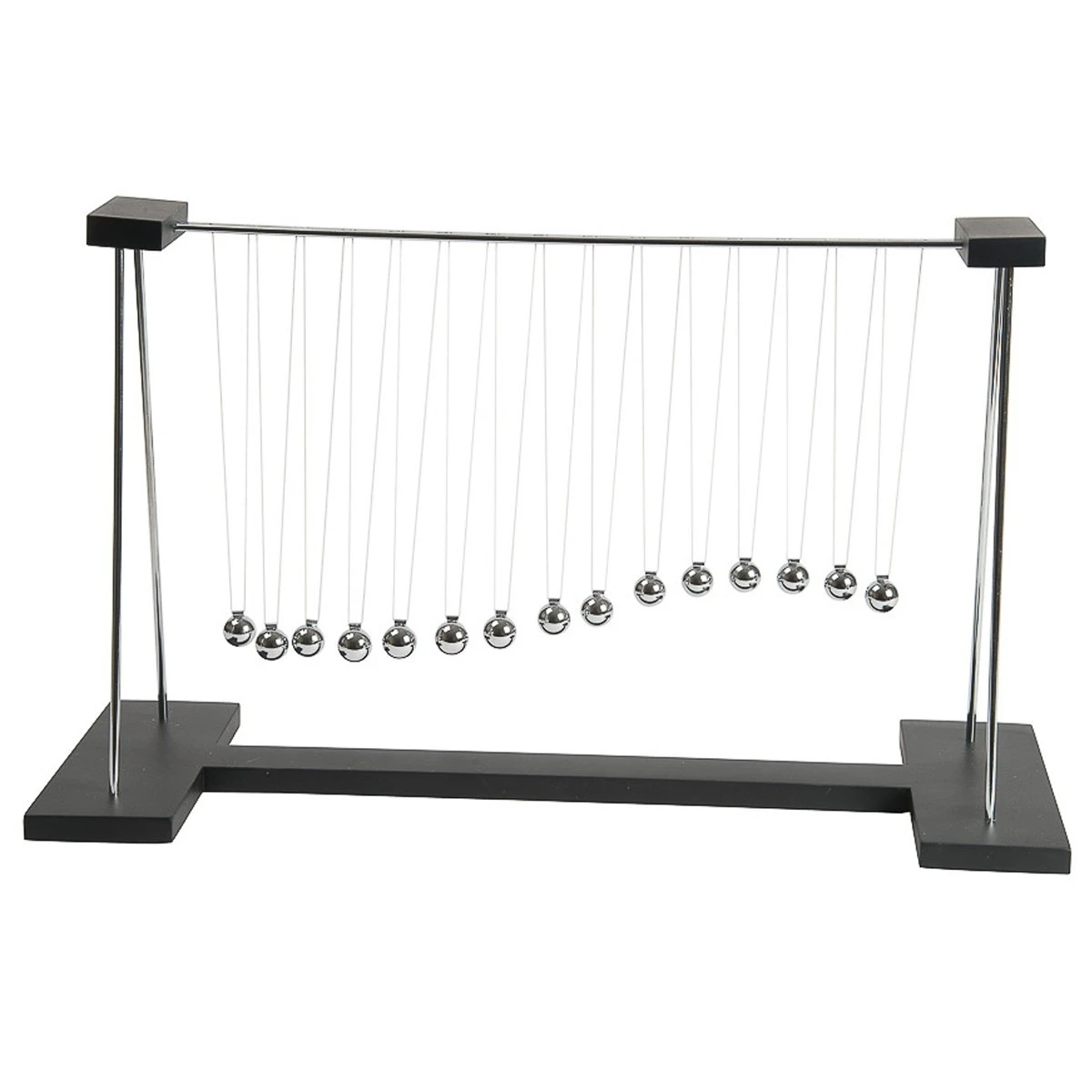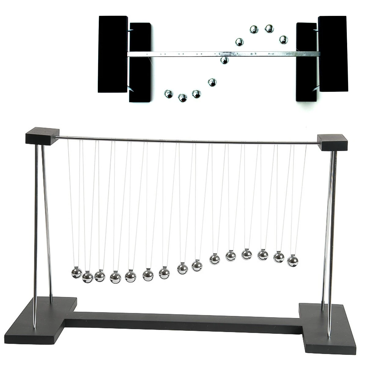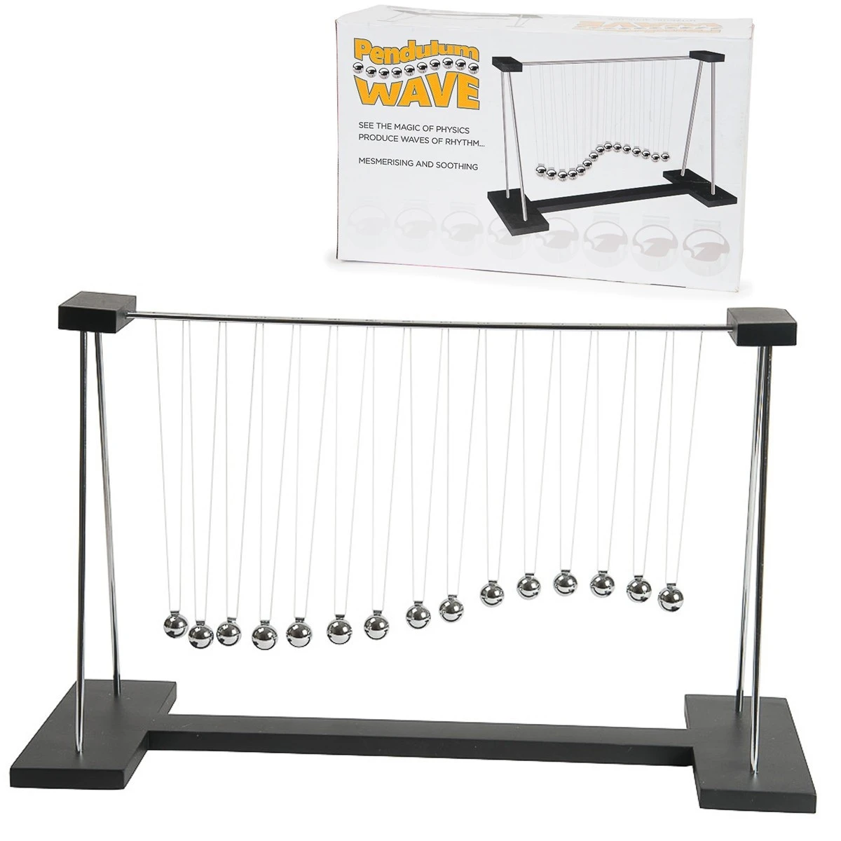 Ce bel objet qui ornera avantageusement votre bureau fait simplement la démonstration scientifique de la force de rappel qu’exerce l’apesanteur. Les quinze billes d’acier suspendues à des fils presque invisibles ont tous des tailles différentes. Il vous suffit de pousser simultanément les billes du Maxi pendule wave à l’aide de la barre en bois fournie puis de les relâcher subitement pour activer le processus. Le résultat est fabuleux : toutes les billes commencent à se balancer d’un côté à l’autre de manière pendulaire. Les billes se déplacent ensemble au départ puis leur vitesse varie progressivement. L’effet ondulatoire s’accélère donnant l’illusion d’un serpent qui se déplace puis les mouvements deviennent plus chaotiques. Il n’est pas rare de retrouver ces appareils de démonstration scientifique dans des musées, ce qui fait du parfait.