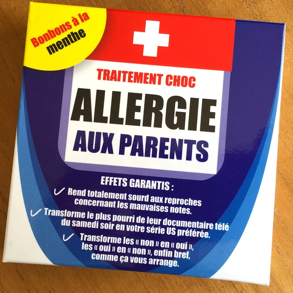 Nos laboratoires ont développé une formule adaptée à l’adolescent à base d’extrait de Mégaglandine. Un traitement quotidien avec une prise le matin protège votre ado en l’immunisant contre votre « dictature » : couvre-feu, corvées barbares comme le rangement, le ménage ou la vaisselle. Les remarques des parents ne sont dès lors plus considérées comme d’un autre siècle notamment sur ce qui concerne le style vestimentaire. Père et mère ne sont plus assimilés à de vieux schnocks coincés à l’esprit compliqué. Un surdosage provoque des effets secondaires auxquels le jeune peut éprouver rapidement une dépendance : Surdité totale aux reproches, transformation du « non » en « oui » et vice-versa ou encore une appétence pour les documentaires télé perçus alors comme des séries US exceptionnelles !