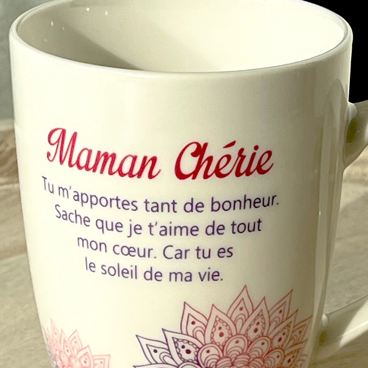 Cette tasse originale est un petit cadeau sympa et pas cher à offrir à votre maman en toute occasion et pas seulement . Un mug dans lequel elle pourra boire sa boisson préférée et sur lequel il est inscrit un gentil poème : »Maman chérie, tu m’apportes tant de bonheur. Sache que je t’aime de tout mon coeur. Car tu es le soleil de ma vie ». Livré dans son avec cordelette de transport, ce mug aux mots doux tolère à la fois le passage au four micro-ondes et au lave-vaisselle. Un cadeau utile qui fera fondre votre maman de bonheur.