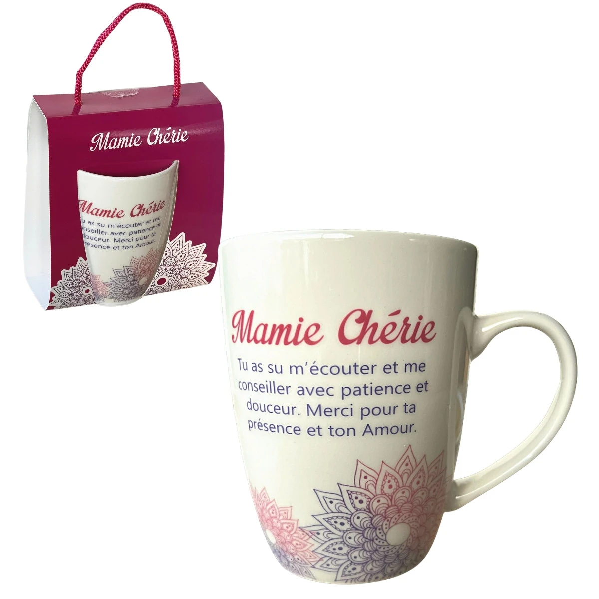 Cette tasse originale est un petit cadeau sympa et pas cher à offrir à votre Mamie en toute occasion et pas seulement . Un mug dans lequel elle pourra boire sa boisson préférée et sur lequel il est inscrit un gentil message : »Mamie chérie, tu as su m’écouter et me conseiller avec patience et douceur. Merci pour ta présence et ton Amour ». Livré dans son avec cordelette de transport, ce mug aux mots doux tolère à la fois le passage au four micro-ondes et au lave-vaisselle. Un cadeau utile qui fera sans nul doute très plaisir à votre chère Mamie.