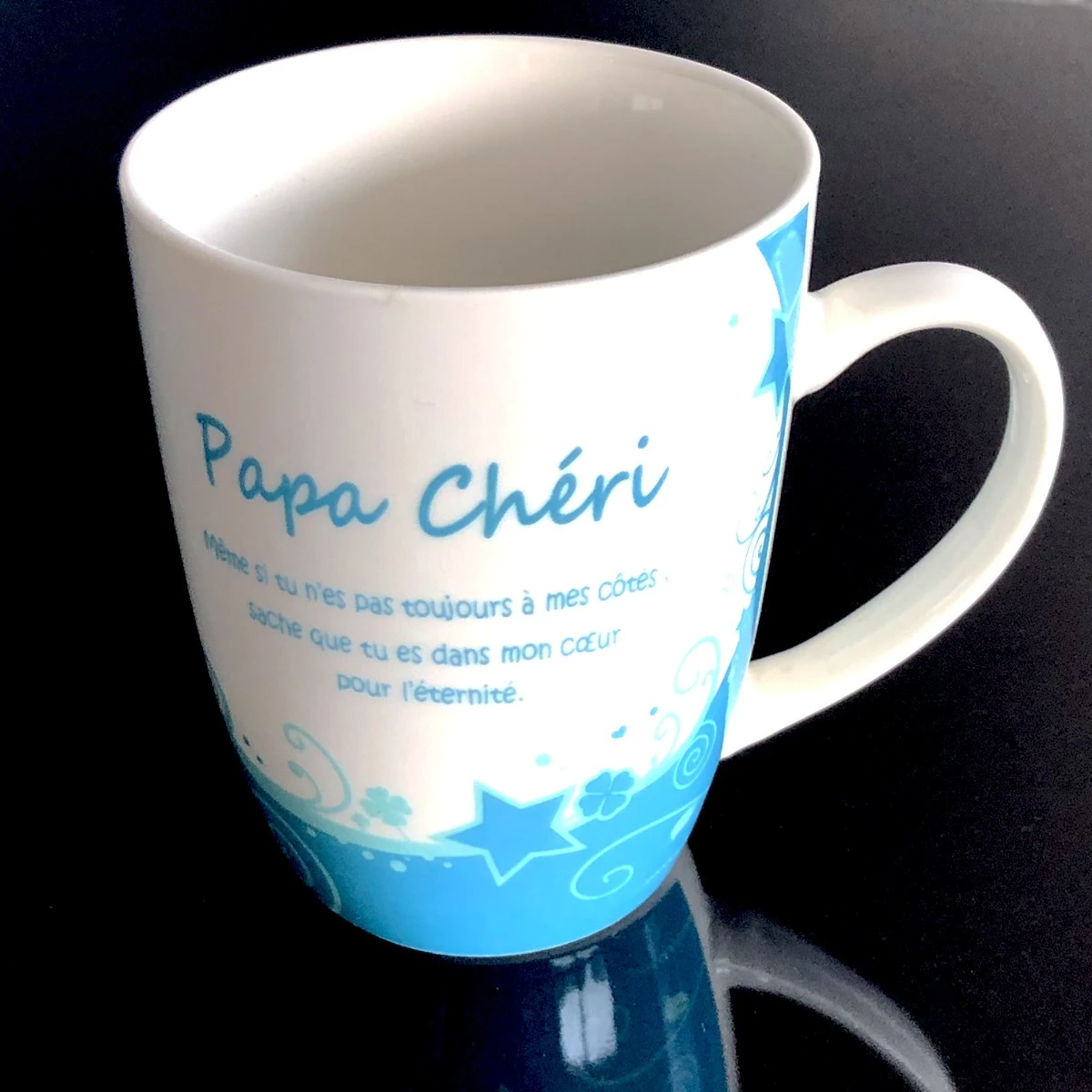 Cette tasse originale est un petit cadeau sympa et pas cher à offrir à votre père en toute occasion et pas seulement . Un mug dans lequel il pourra boire sa boisson préférée et sur lequel il est inscrit un gentil message : »Papa chéri, même si tu n’es pas toujours à mes côtés, sache que tu es dans mon coeur pour l’éternité ». Livré dans son avec cordelette de transport, ce mug aux mots doux tolère à la fois le passage au four micro-ondes et au lave-vaisselle. Un cadeau utile qui fera sans nul doute très plaisir à votre papa chéri.