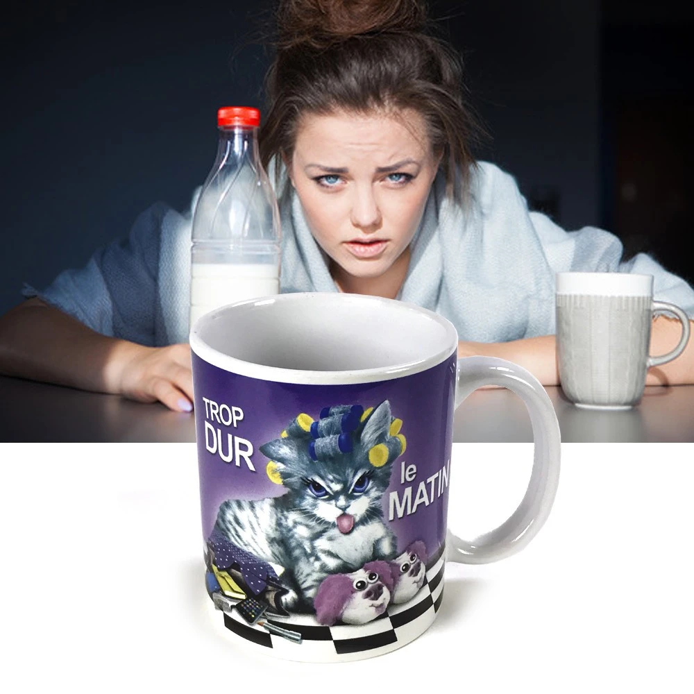 Le est une mug humoristique destiné à tous ceux ou toutes celles qui ont un VRAI problème avec le matin. Cette tasse humoristique comporte un dessin de chaton au visage grimaçant et de très mauvaise humeur. Quand on sait que les chats apprécient particulièrement de dormir de longues heures, rien d’étonnant à ce que le dessinateur s’en soit inspiré. L’impression de ce dessin amusant est réalisée sur l’ensemble du contour de la tasse, des deux côtés donc. Un .
