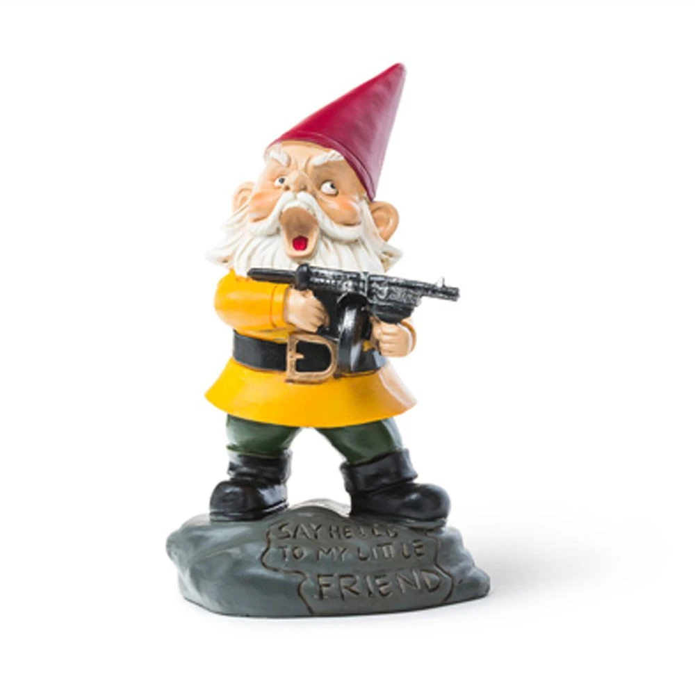 Le Nain de jardin armé est à poser dans votre cours d’entrée et il affiche clairement la couleur. Une petite phrase est même gravée à ses pieds : « Say hello to my little friend » !