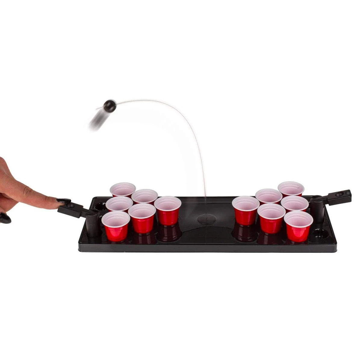 Le est compact et peut être utilisé n’importe où pourvu qu’on ait une table à disposition. Le principe du jeu est identique au beer pong original, un subtile mélange de soif sévère et de précision au lancer, seule différence, les gobelets sont plus petits et la balle est attachée et se lance à l’aide de deux propulseurs. Les gobelets sont plus petits donc la difficulté augmente et c’est notamment pour cela que la balle est attachée. Chaque joueur remplit six gobelets avec son « eau minérale préférée » (Tequila, Vodka, whisky ou autre breuvage à réveiller un mort…) et les dispose comme des quilles de bowling sur le plateau de jeu. L’adversaire lance la . Si la balle tombe dans un verre, le joueur à qui appartient le verre doit en vider le contenu. Un jeu d’adresse hilarant qui deviendra probablement aléatoire au fil des parties en fonction des aptitudes de chacun des joueurs, on vous fait confiance pour adapter les règles du jeu au fur et à mesure. Un Cadeau parfait pour une soirée entre amis comme un enterrement de vie de célibataire par exemple. Nous vous rappelons bien évidemment que la consommation élevée d’alcool peut influencer la perception et la capacité de réaction (tu m’étonnes…).